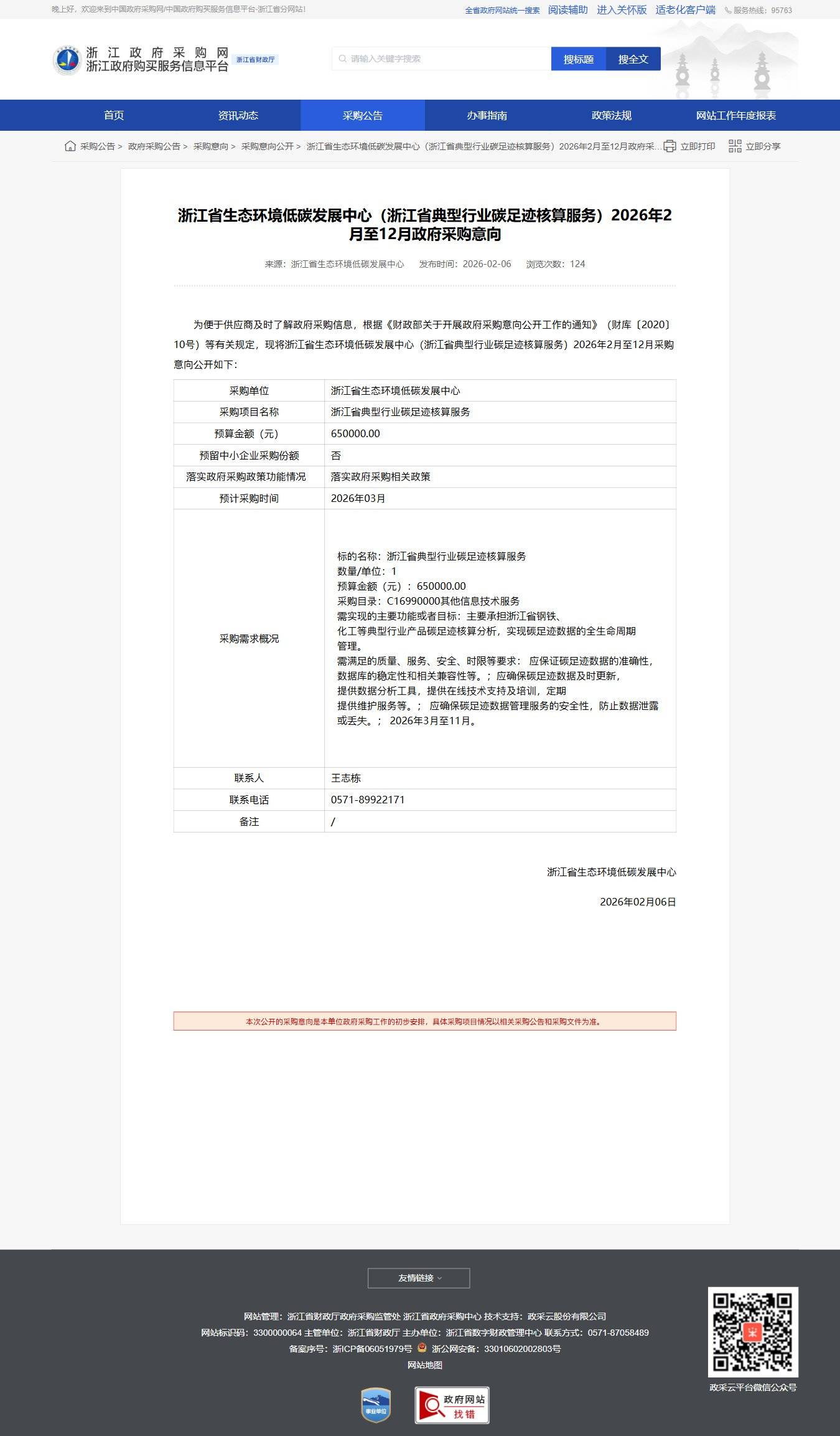 浙江省生態(tài)環(huán)境低碳發(fā)展中心(浙江省典型行業(yè)碳足跡核算服務(wù))2026年2月至12月政府采購意向公告