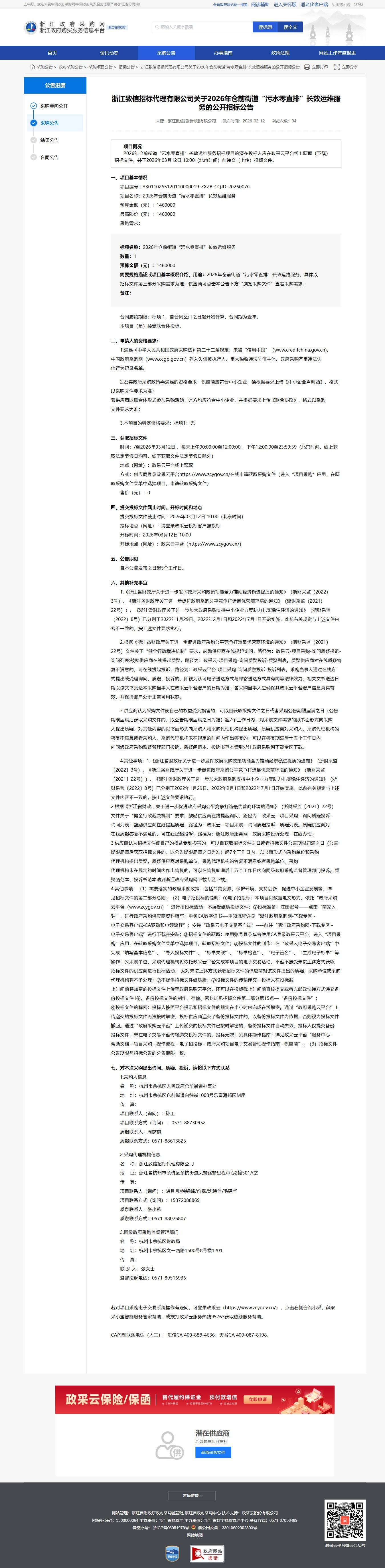 浙江致信招標代理有限公司關于2026年侖前街道“污水零直排”長效運維服務的公開招標公告