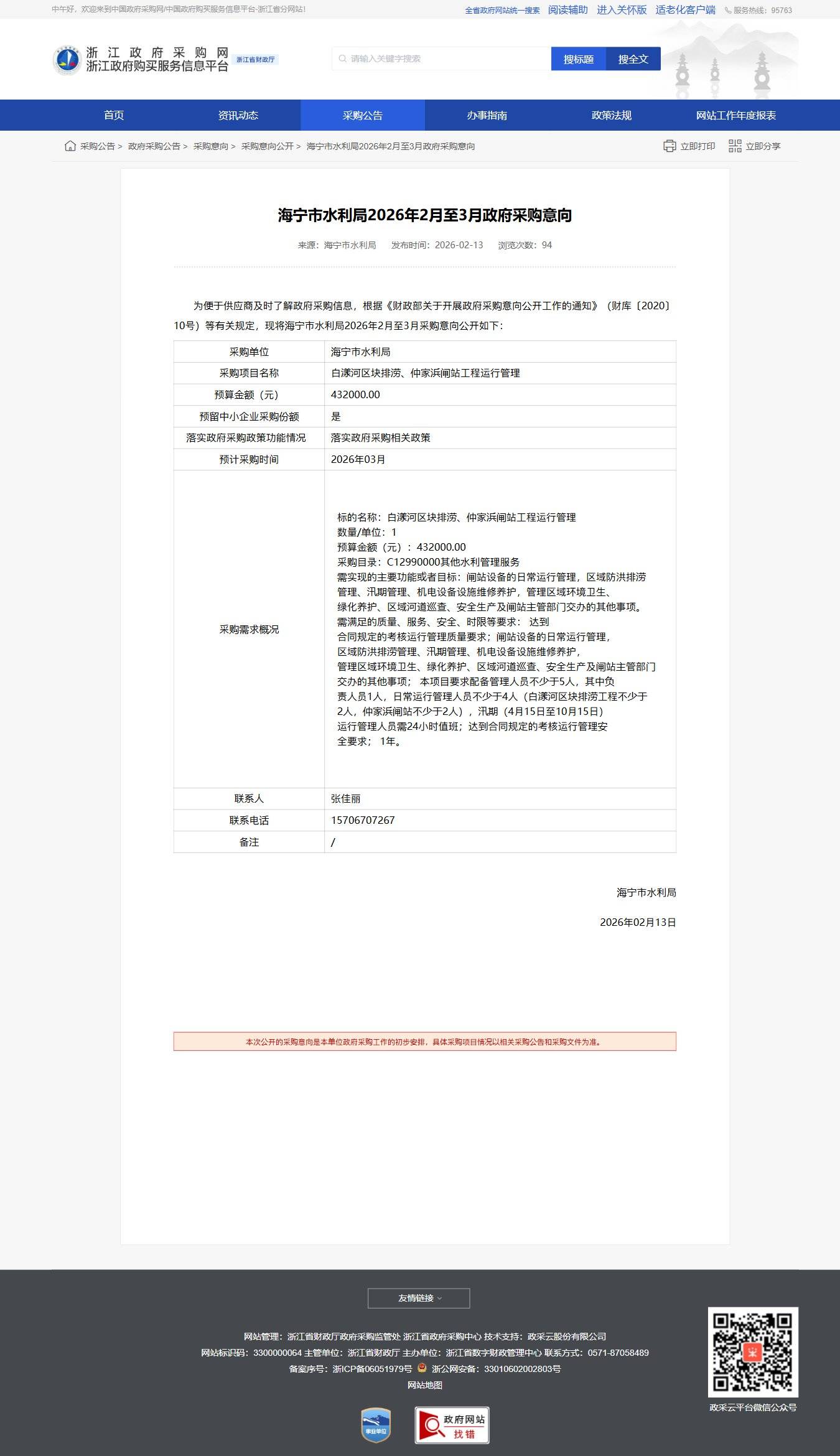 浙江海寧市水利局2026年2月至3月政府采購意向公告