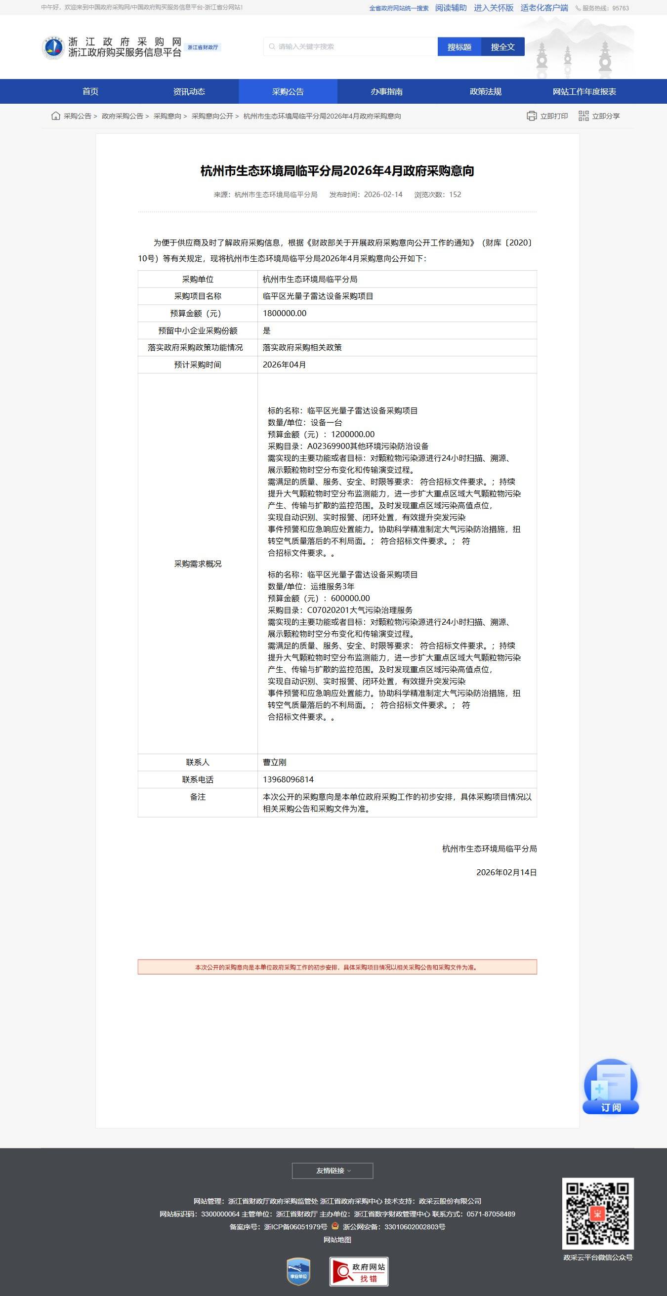 浙江杭州市生態環境局臨平分局2026年4月政府采購意向公告
