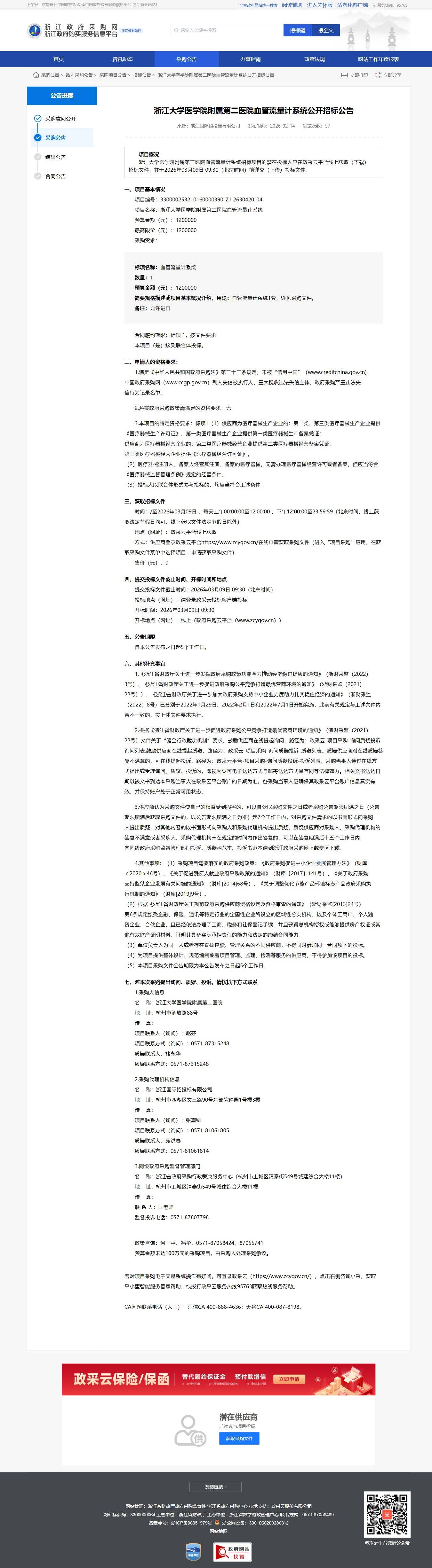 浙江大學醫學院附屬第二醫院血管流量計系統公開招標公告