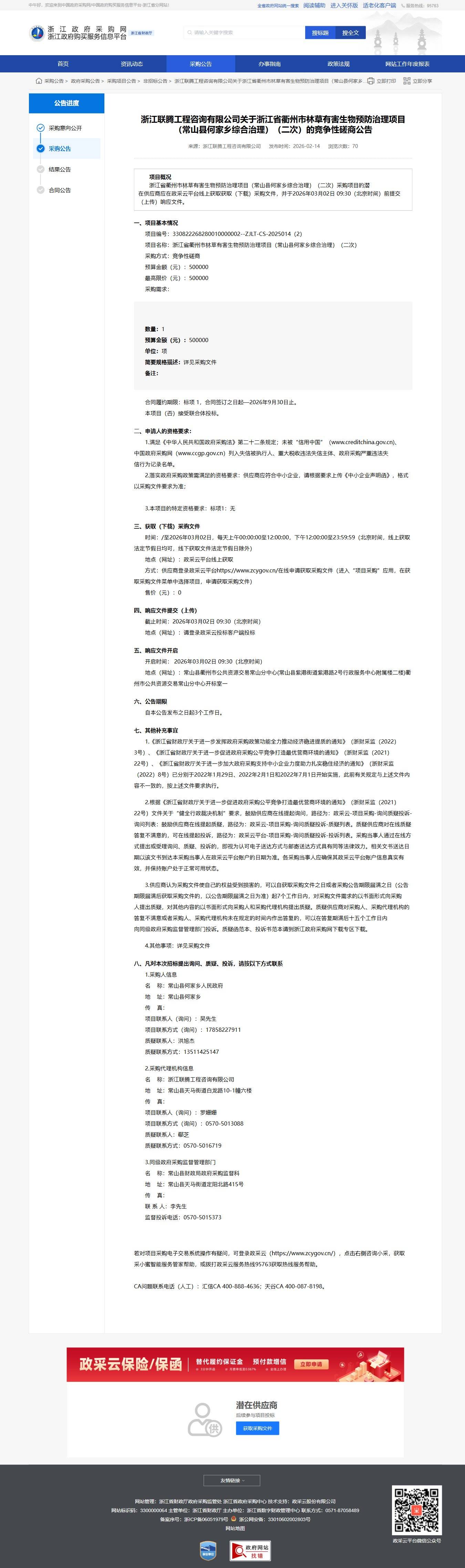 浙江聯騰工程咨詢有限公司關于浙江省衢州市林草有害生物預防治理項目(常山縣何家鄉綜合治理)(二次)的競爭性磋商公告
