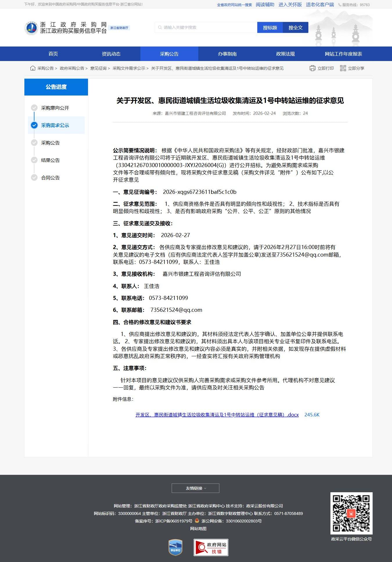 浙江關于開發區、惠民街道城鎮生活垃圾收集清運及1號中轉站運維的征求意見