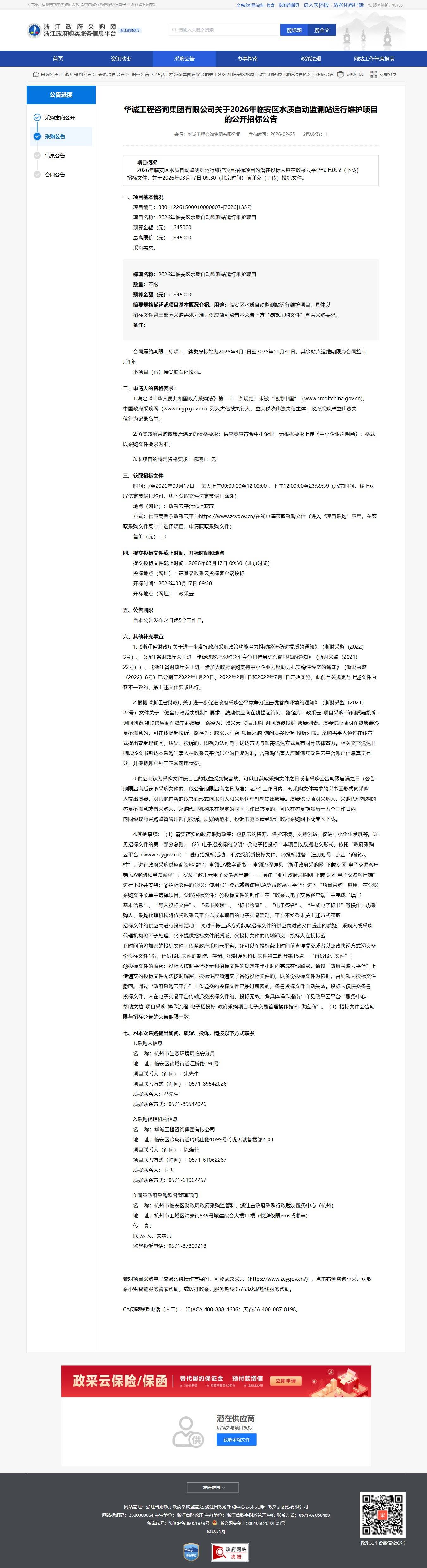 華誠工程咨詢集團(tuán)有限公司關(guān)于2026年臨安區(qū)水質(zhì)自動(dòng)監(jiān)測(cè)站運(yùn)行維護(hù)項(xiàng)目的公開招標(biāo)公告