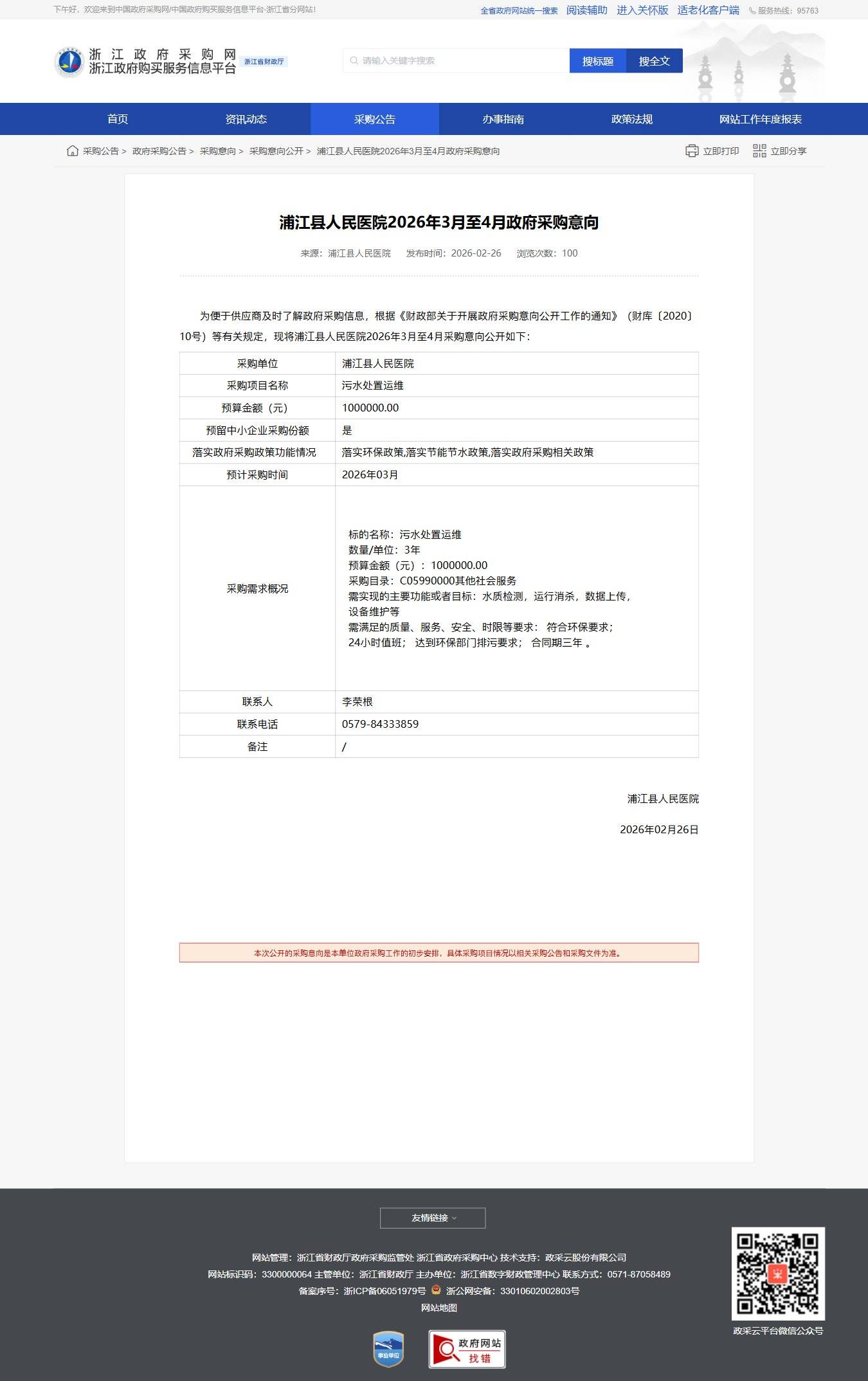 浙江浦江縣人民醫院2026年3月至4月政府采購意向公告