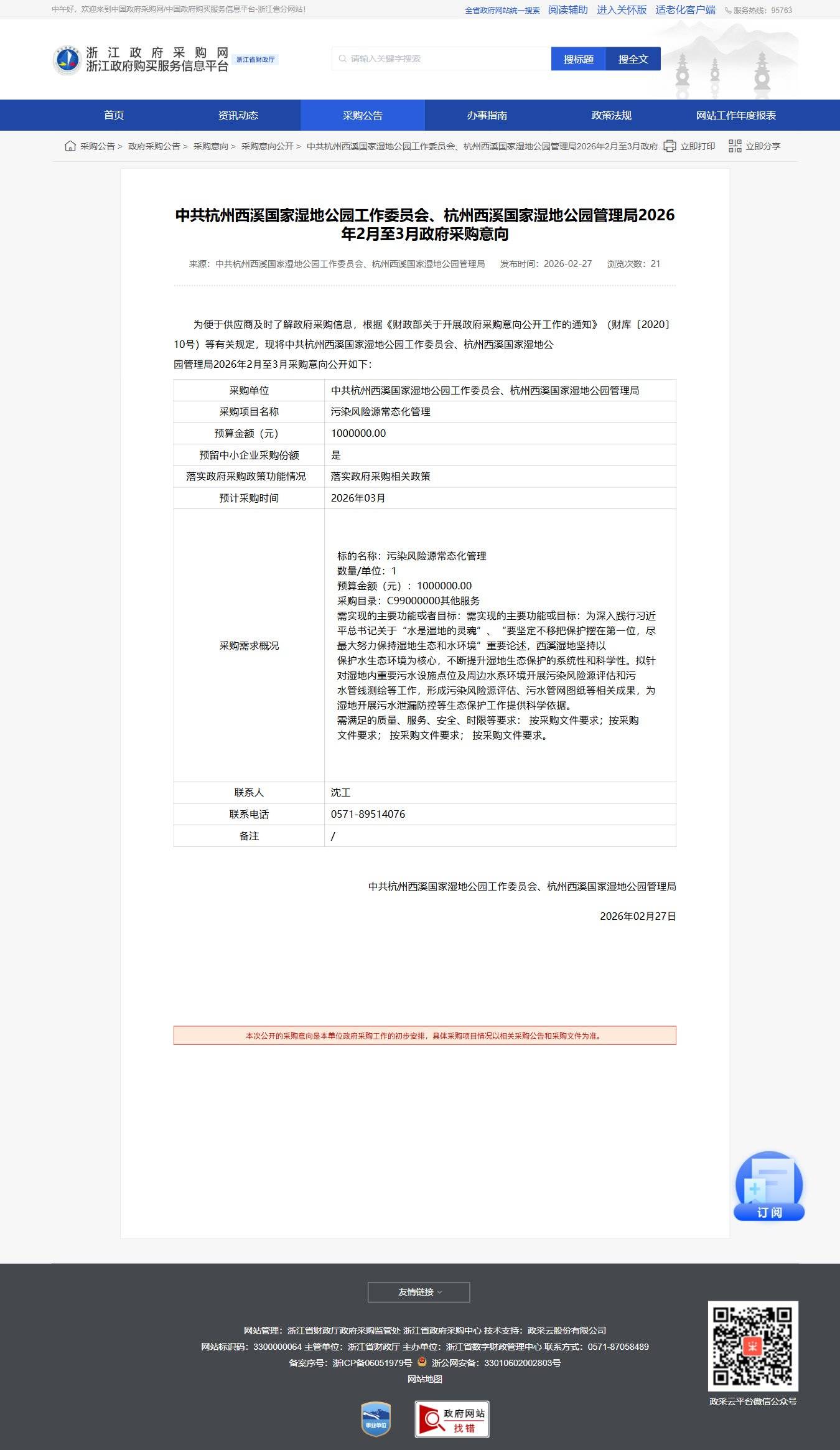 中共杭州西溪國(guó)家濕地公園工作委員會(huì)、杭州西溪國(guó)家濕地公園管理局2026年2月至3月政府采購意向