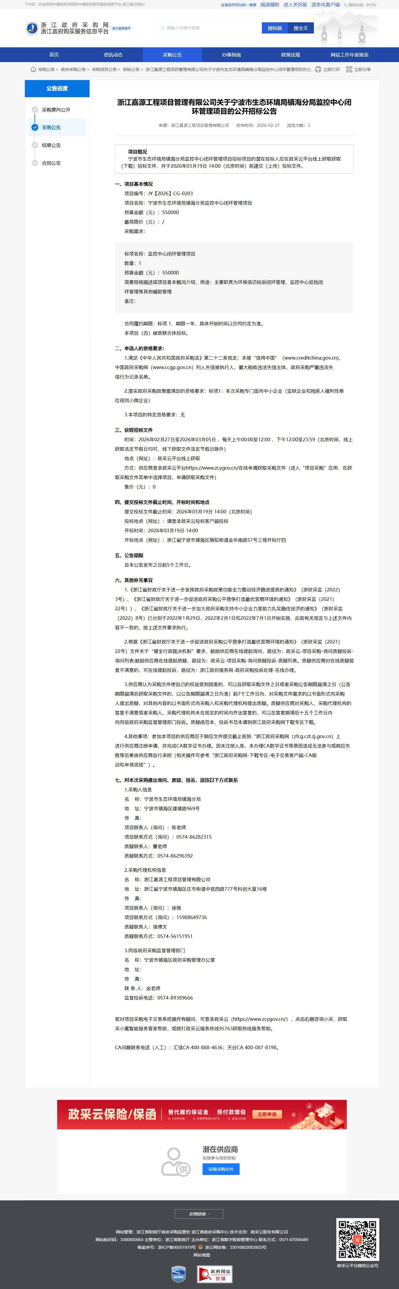 浙江嘉源工程項目管理有限公司關于寧波市生態環境局鎮海分局監控中心閉環管理項目的公開招標公告