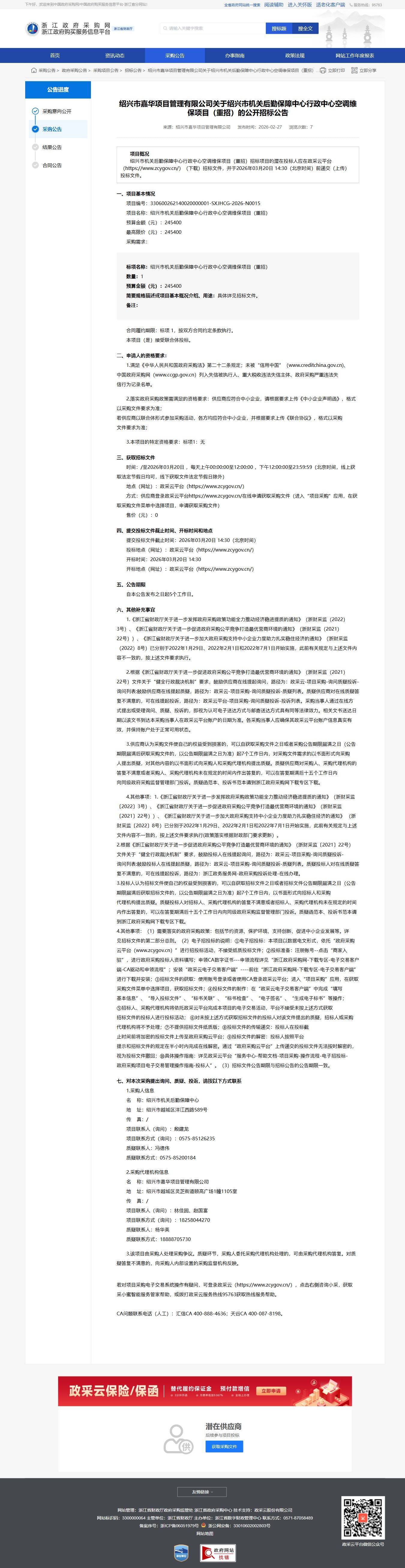 浙江關于紹興市機關后勤保障中心行政中心空調維保項目(重招)的公開招標公告