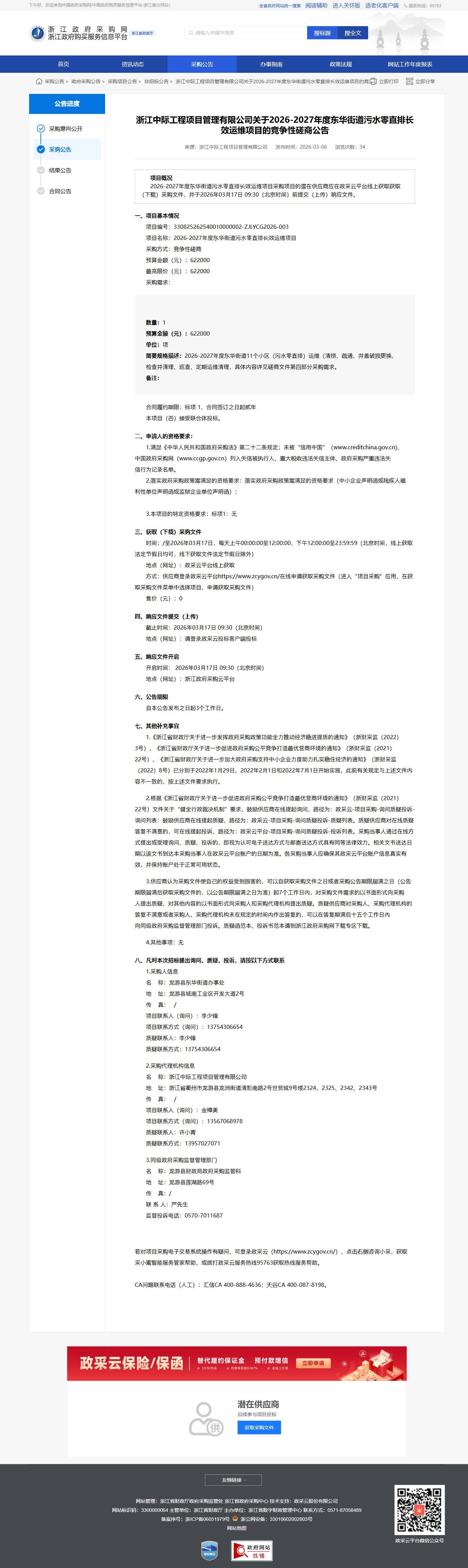 浙江關于2026-2027年度東華街道污水零直排長效運維項目的競爭性磋商公告
