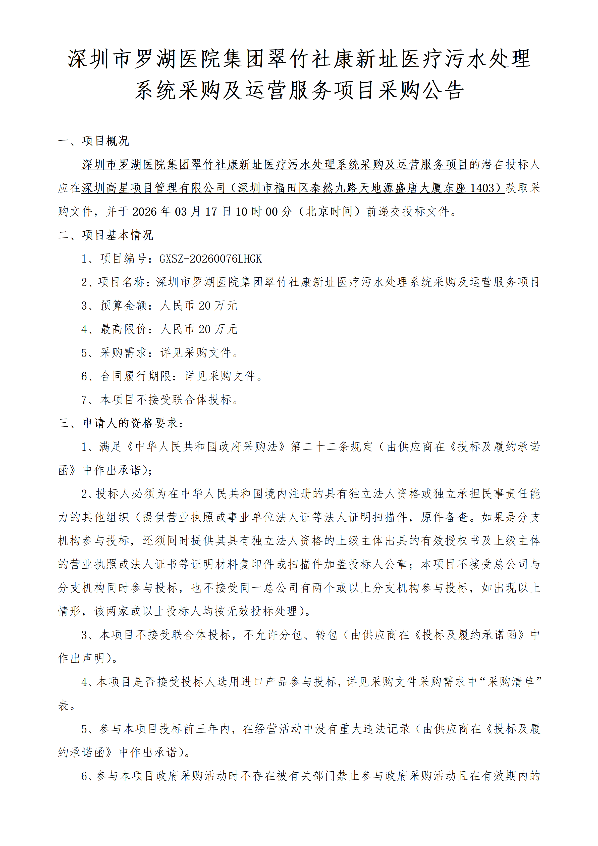 廣東深圳市羅湖醫院集團翠竹社康新址醫療污水處理系統采購及運營服務項目的采購公告