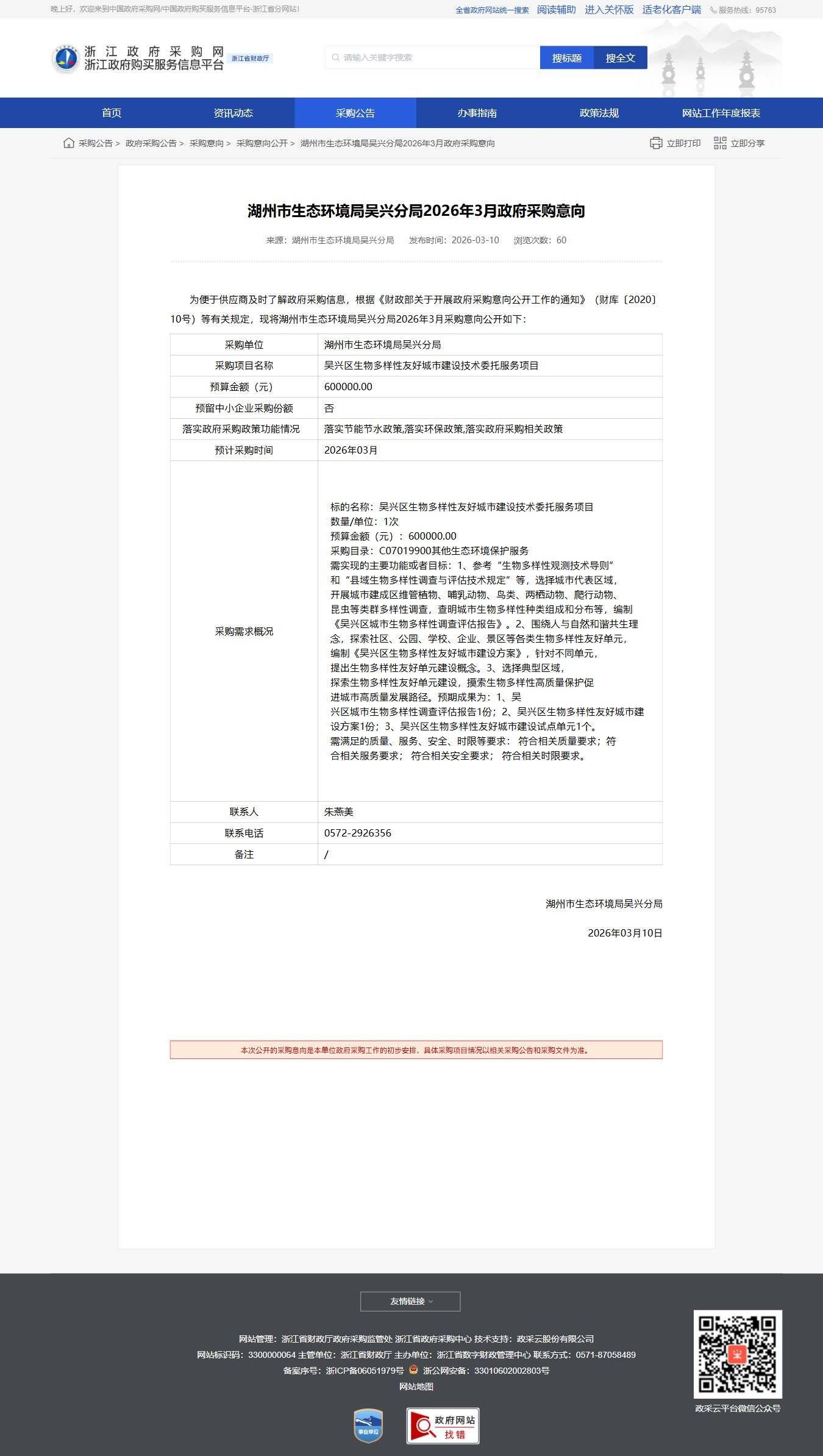 浙江湖州市生態環境局吳興分局2026年3月政府采購意向公告