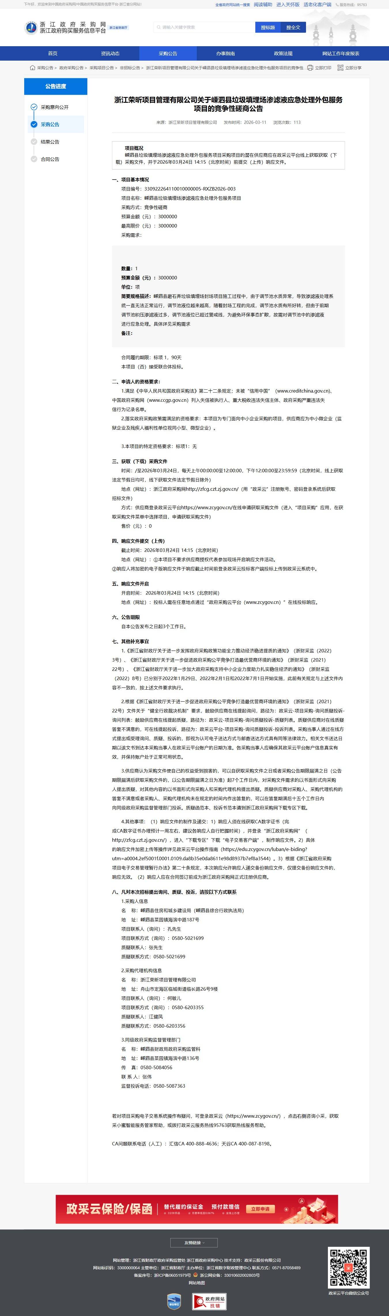 項(xiàng)目名稱:嵊泗縣垃圾填埋場(chǎng)滲濾液應(yīng)急處理外包服務(wù)項(xiàng)目