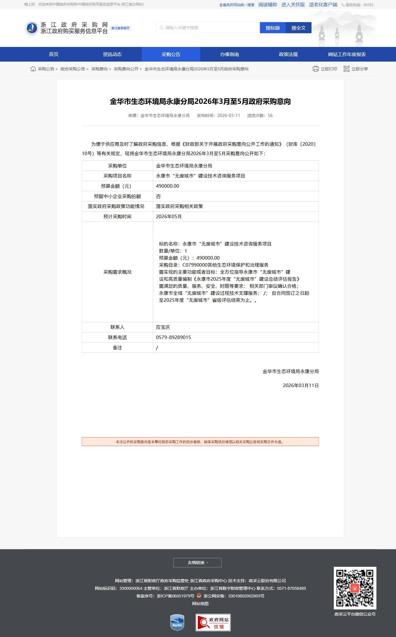 浙江金華市生態環境局永康分局2026年3月至5月政府采購意向公告