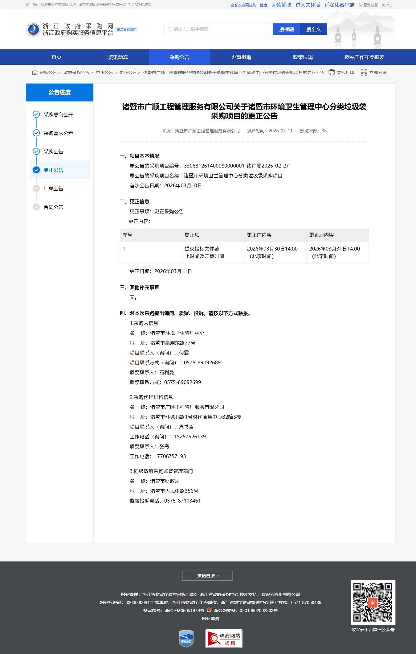 浙江關于諸暨市環境衛生管理中心分類垃圾袋采購項目的更正公告