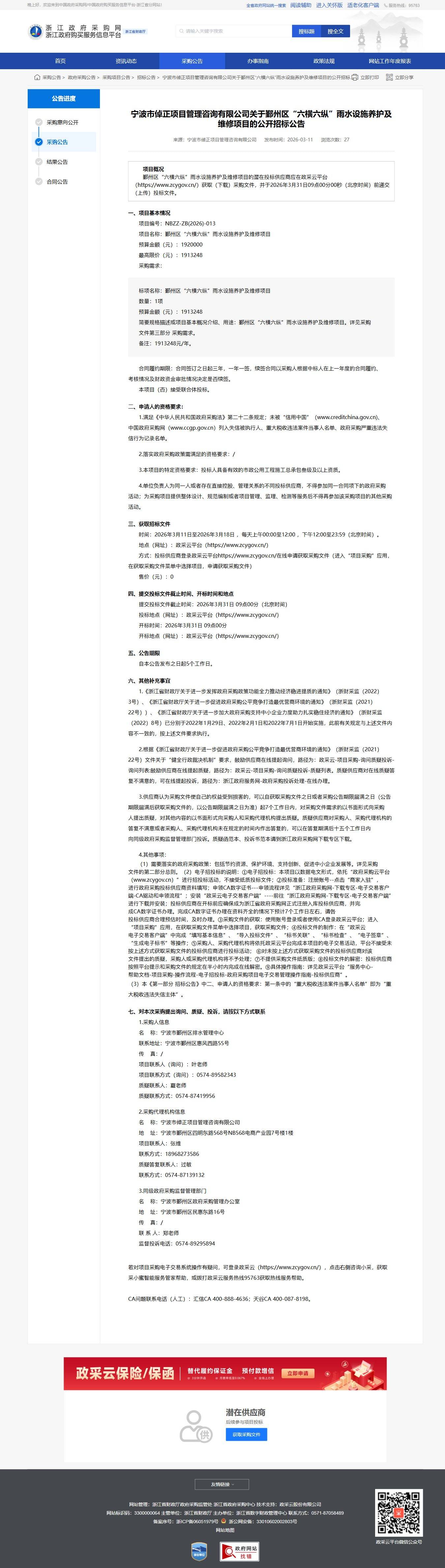 浙江關于鄞州區“六橫六縱”雨水設施養護及維修項目的公開招標公告
