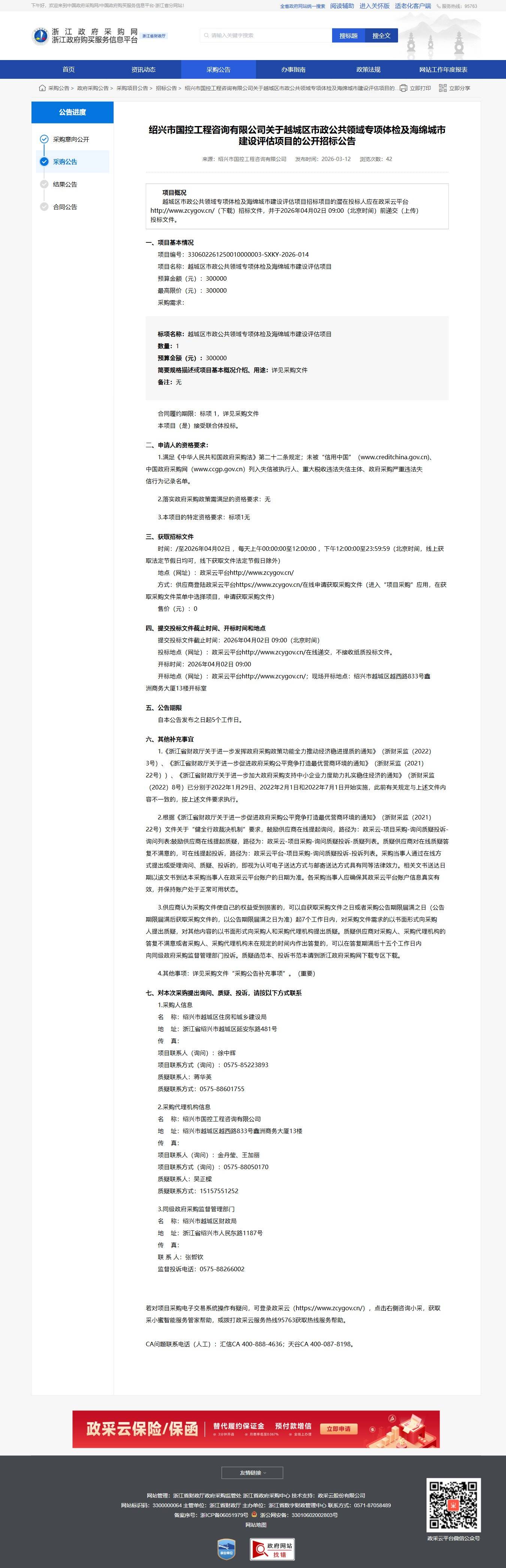 采購需求: 越城區市政公共領域專項體檢及海綿城市建設評估項目,數量: 1,預算金額: 300,000元。詳見采購文件。