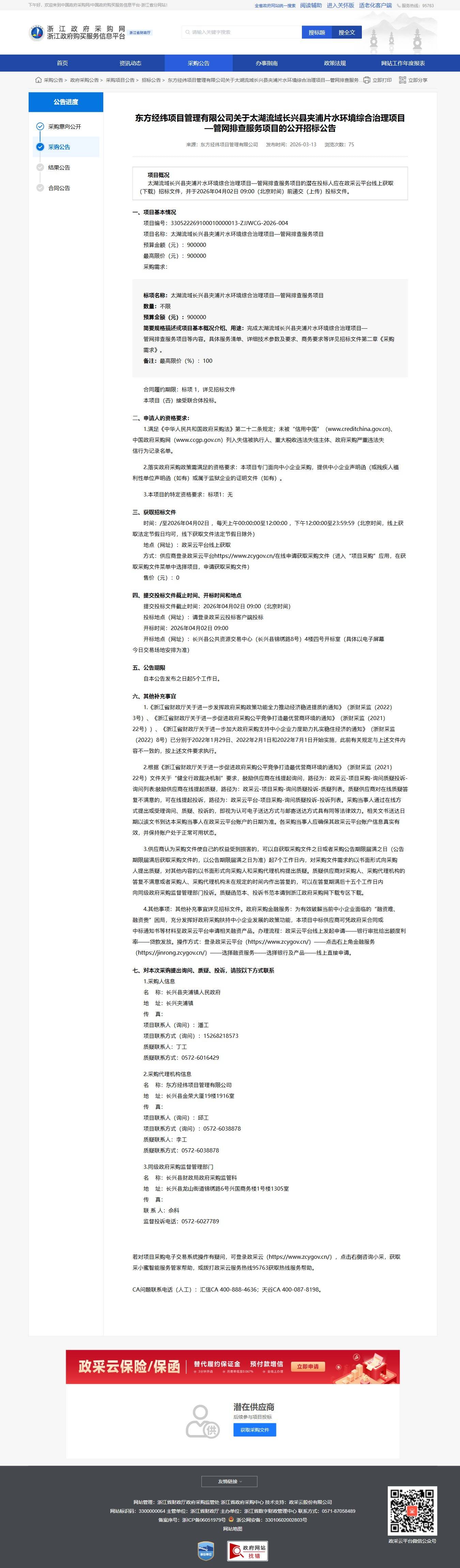 浙江關于太湖流域長興縣夾浦片水環境綜合治理項目—管網排查服務項目的公開招標公告