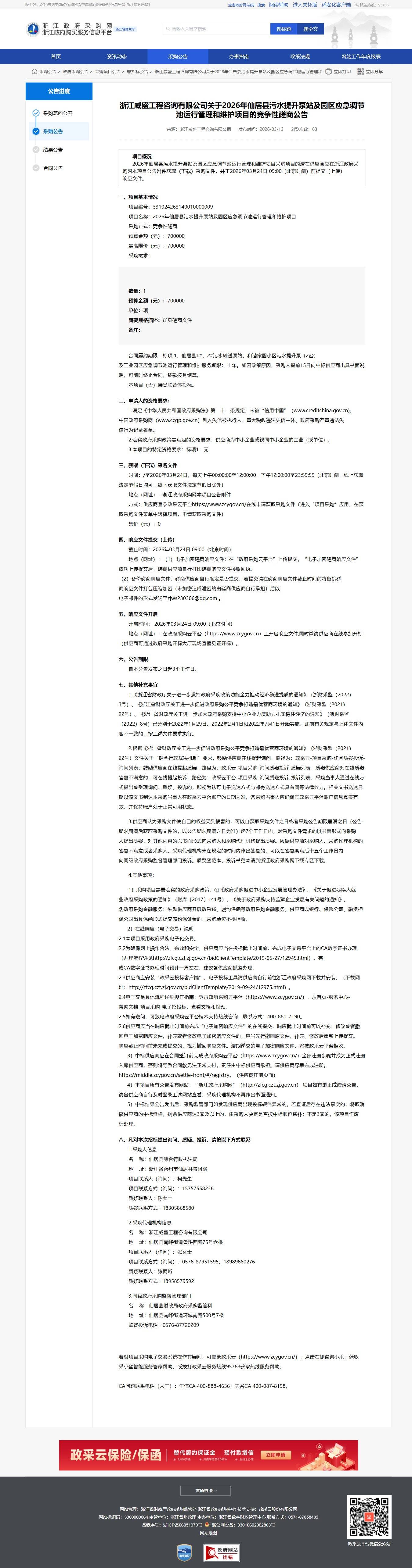 2026年仙居縣污水提升泵站及園區應急調節池運行管理和維護項目采購項目的潛在供應商應在浙江政府采購網本項目公告附件獲取(下載)采購文件,并于2026年03月24日09:00(北京時間)前提交(上傳)響應文件。