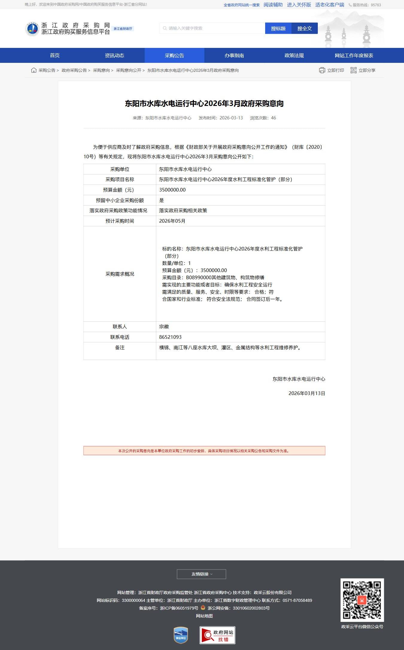 浙江東陽市水庫水電運行中心2026年3月政府采購意向公告