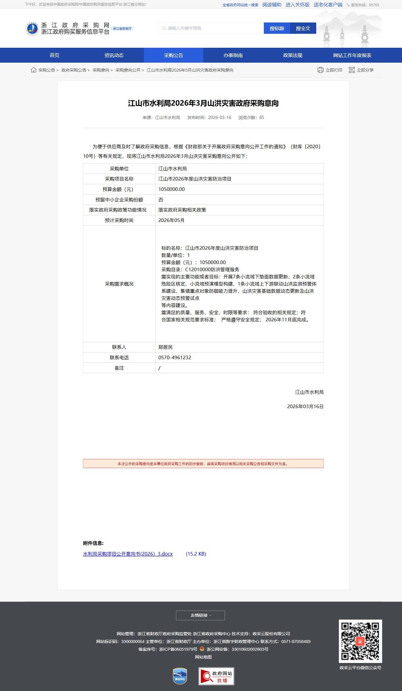 浙江江山市水利局2026年3月山洪災害政府采購意向公告