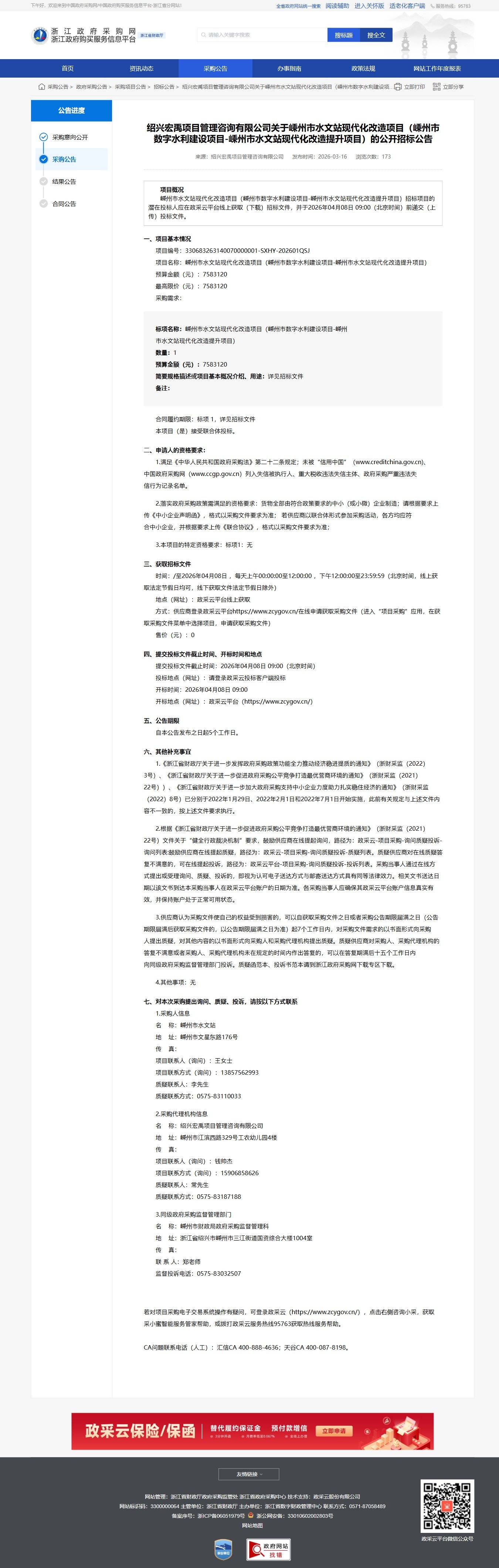 嵊州市水文站現代化改造項目(嵊州市數字水利建設項目-嵊州市水文站現代化改造提升項目)招標項目的潛在投標人應在政采云平臺線上獲。ㄏ螺d)招標文件,并于2026年04月08日09:00(北京時間)前遞交(上傳)投標文件。