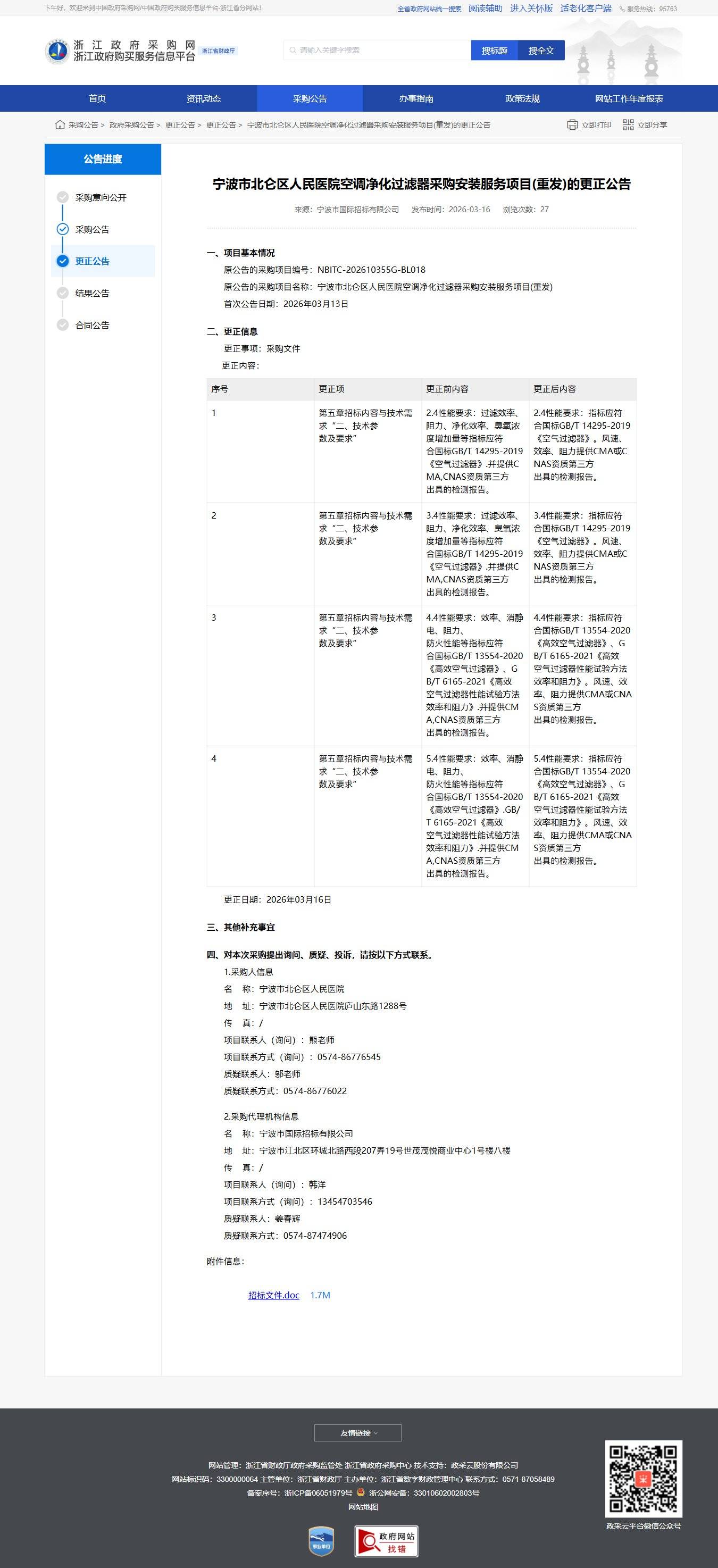 浙江寧波市北侖區人民醫院空調凈化過濾器采購安裝服務項目(重發)的更正公告