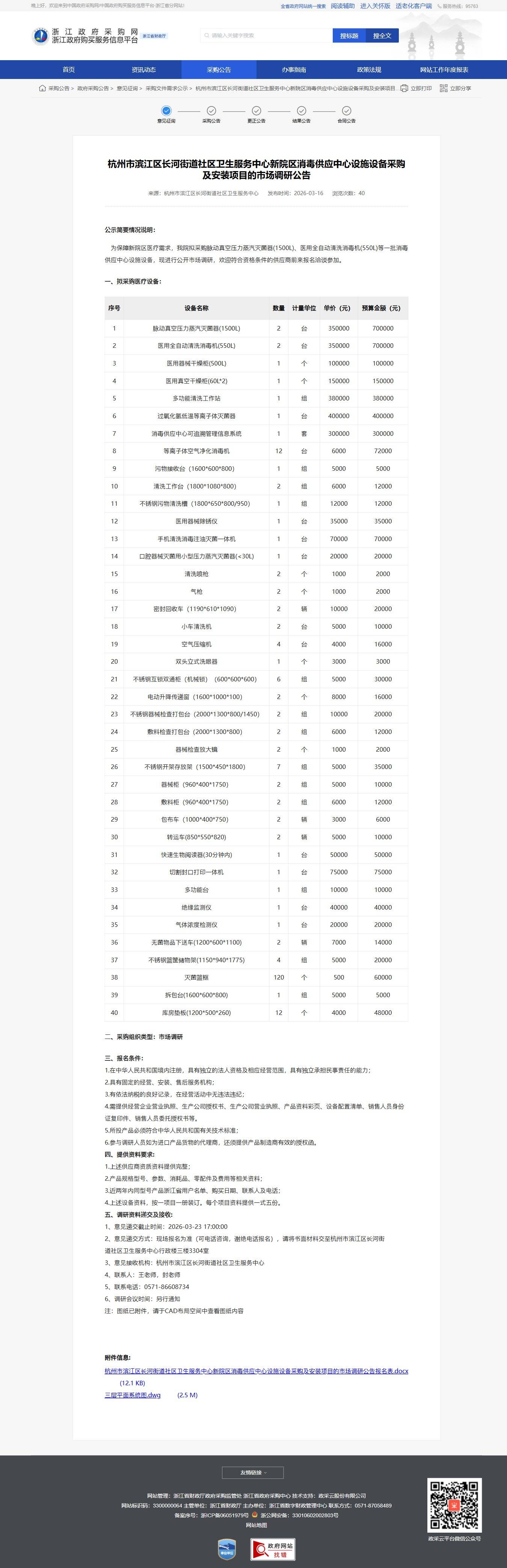 公示簡要情況說明:為保障新院區(qū)醫(yī)療需求,我院擬采購脈動真空壓力蒸汽滅菌器(1500D、醫(yī)用全自動清洗消毒機(550U)等一批消毒供應(yīng)中心設(shè)施設(shè)備,現(xiàn)進行公開市場調(diào)研,歡迎符合資格條件的供應(yīng)商前來報名洽談參加。