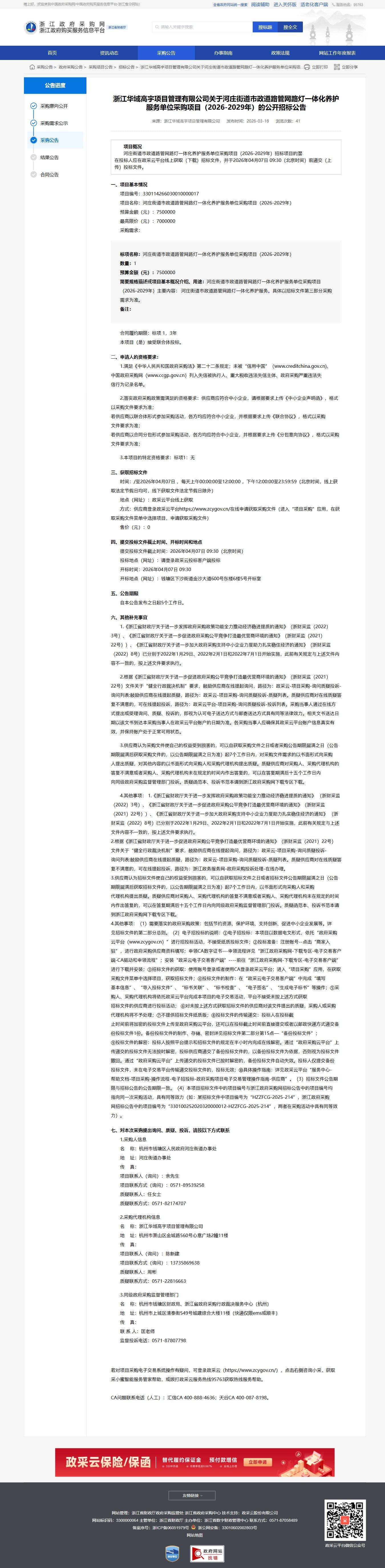 河莊街道市政道路管網路燈一體化養護服務單位采購項目(2026-2029年)的公開招標公告