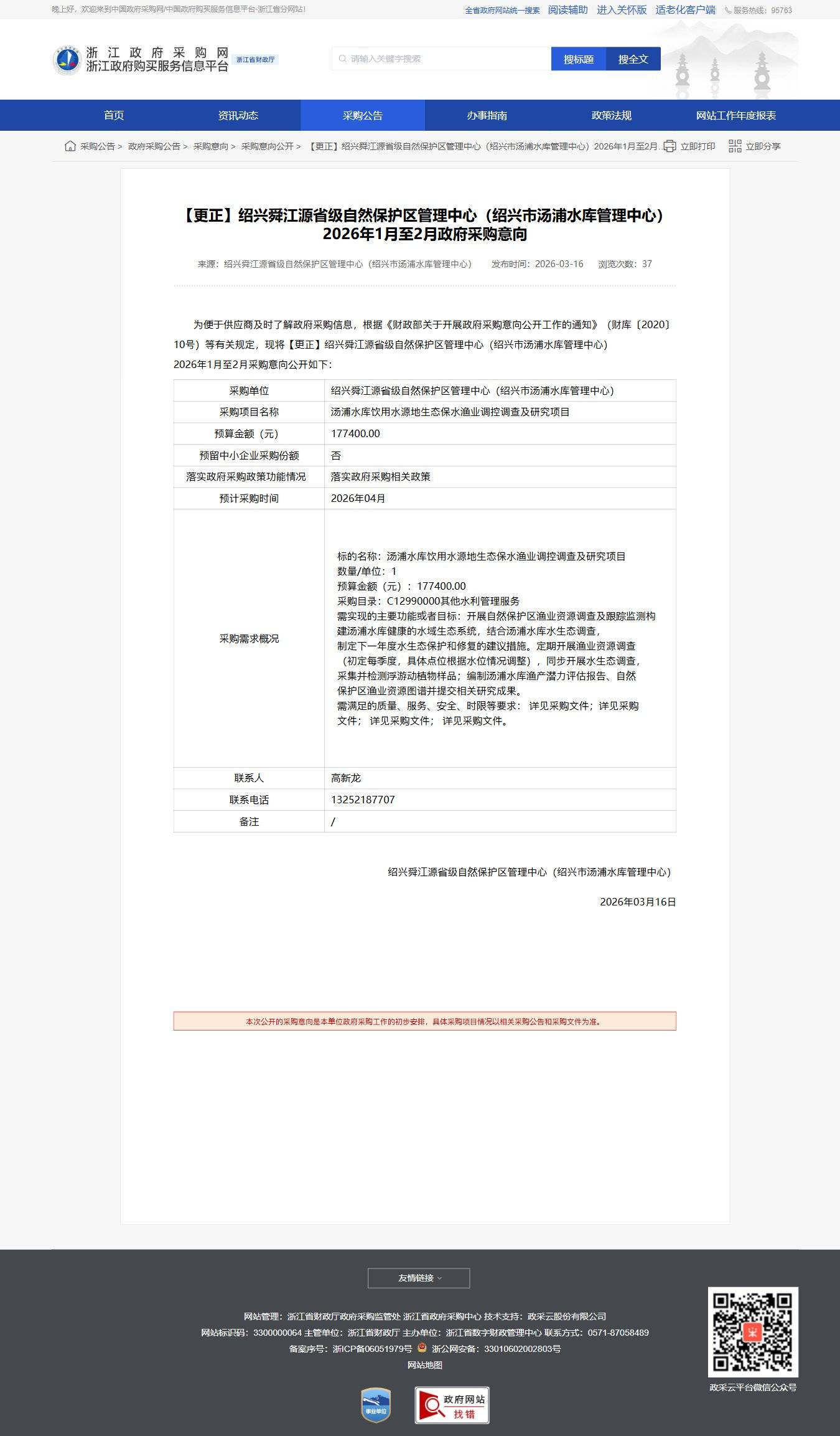 【更正】紹興至江源省級(jí)自然保護(hù)區(qū)管理中心(紹興市湯清水庫(kù)管理中心)2026年1月至2月政府采購(gòu)意向