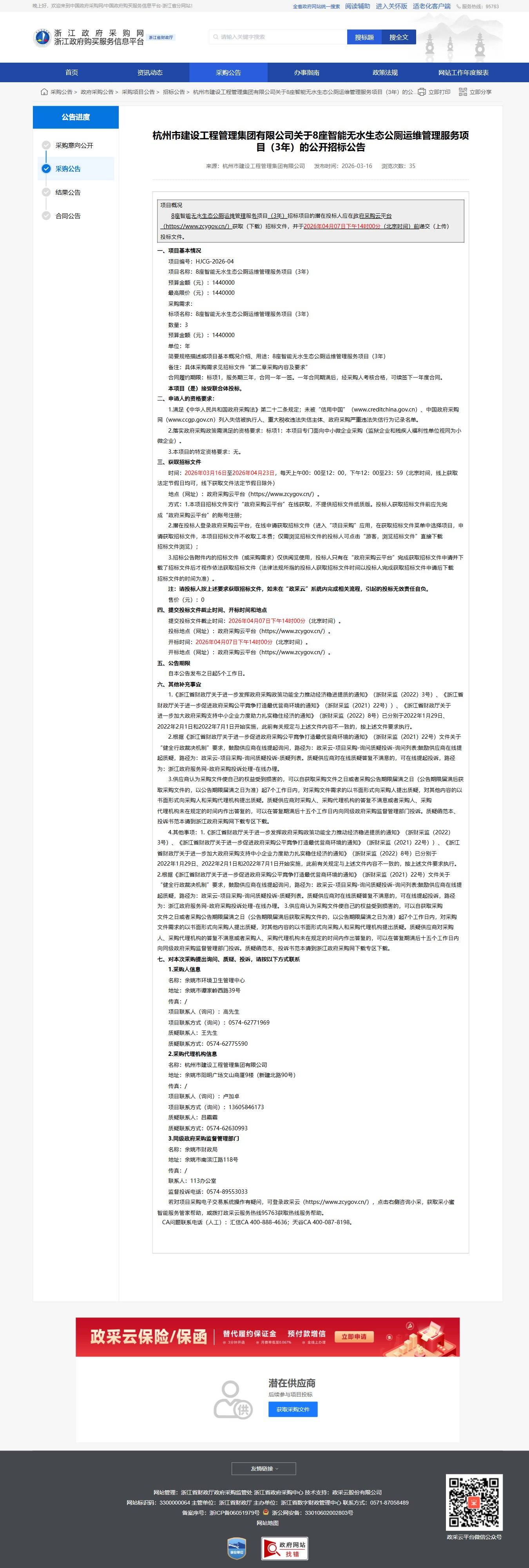 浙江關于8座智能無水生態公廁運維管理服務項目(3年)的公開招標公告