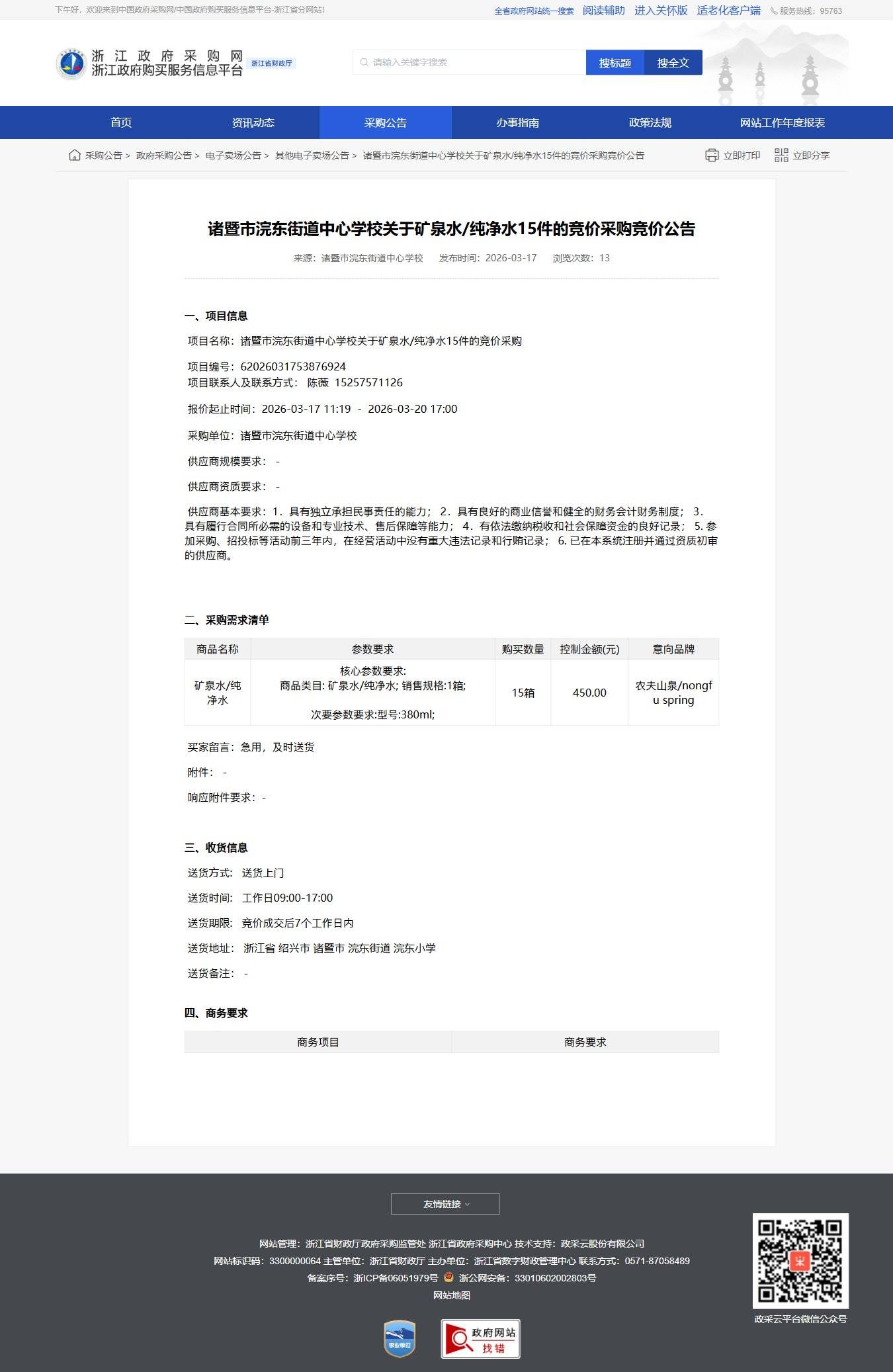 浙江關于礦泉水純凈水15件的競價采購競價公告諸暨市浣東街道中心學校
