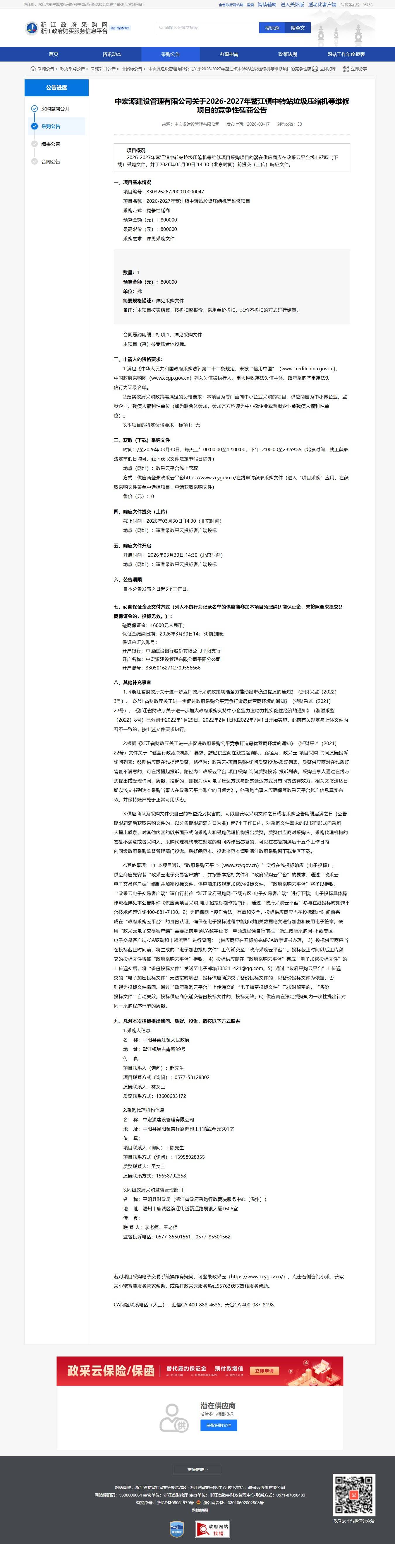 浙江關于2026-2027年鰲江鎮中轉站垃圾壓縮機等維修項目的競爭性磋商公告