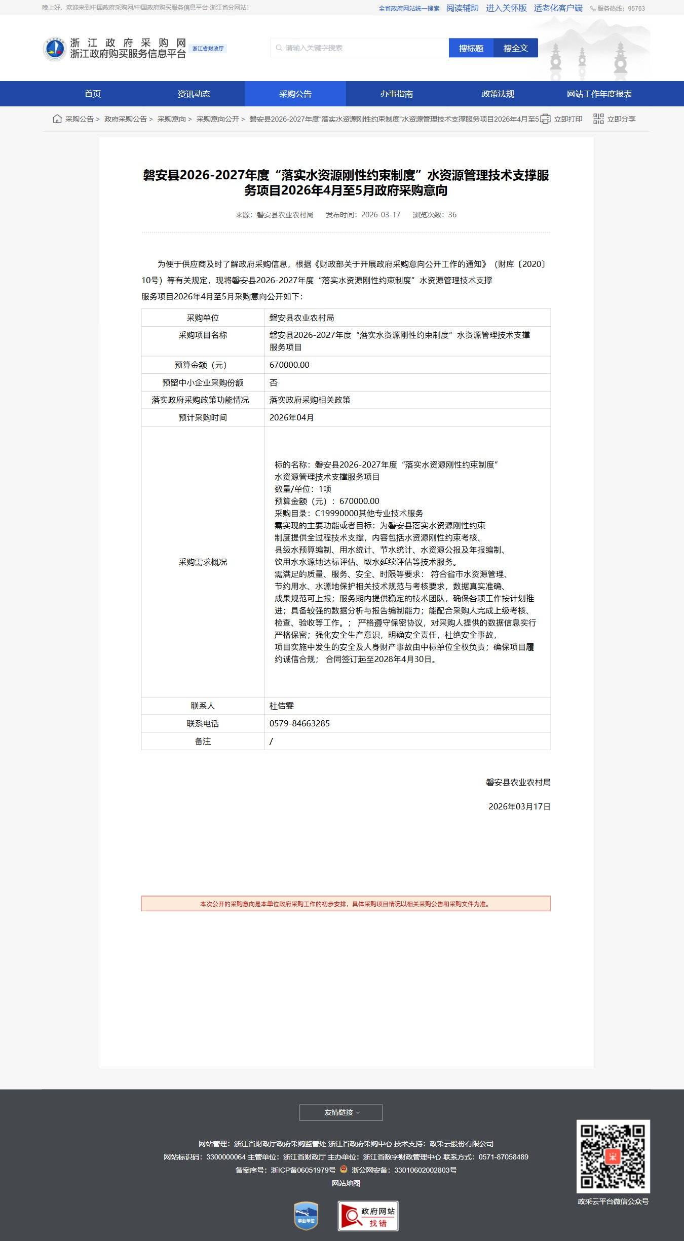 浙江磐安縣2026-2027年度“落實水資源剛性約束制度”水資源管理技術支撐服務項目2026年4月至5月政府采購意向公告