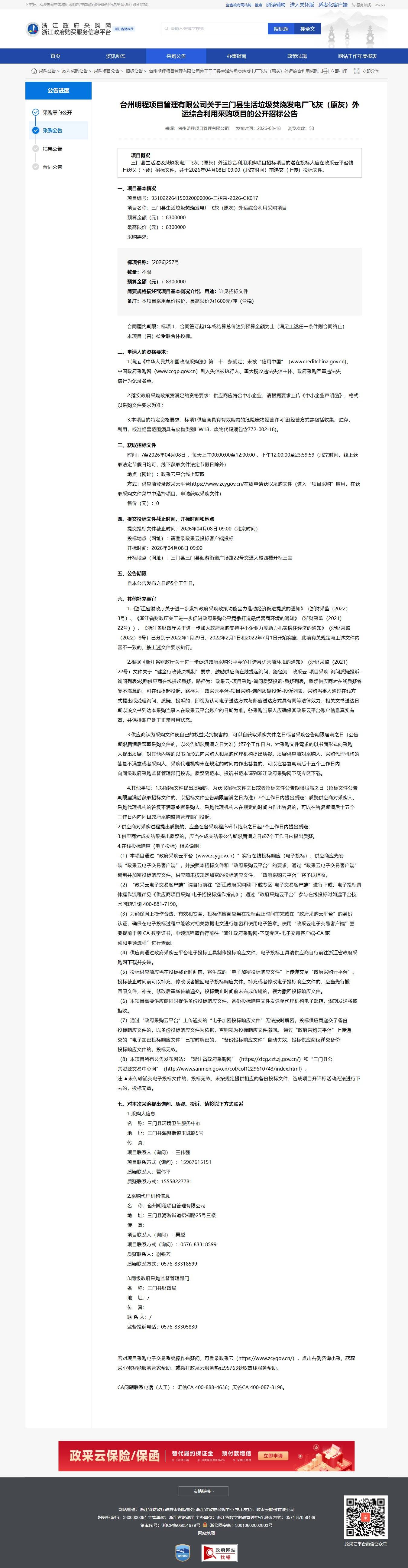 三門縣生活垃圾焚燒發(fā)電廠飛灰(原灰)外運(yùn)綜合利用采購項目