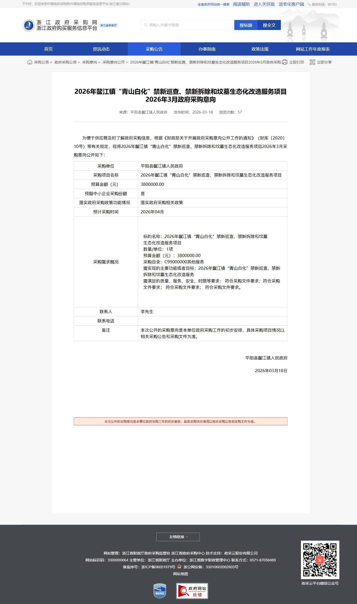 浙江2026年鰲江鎮“青山白化”禁新巡查、禁新拆除和墳墓生態化改造服務項目2026年3月政府采購意向公告