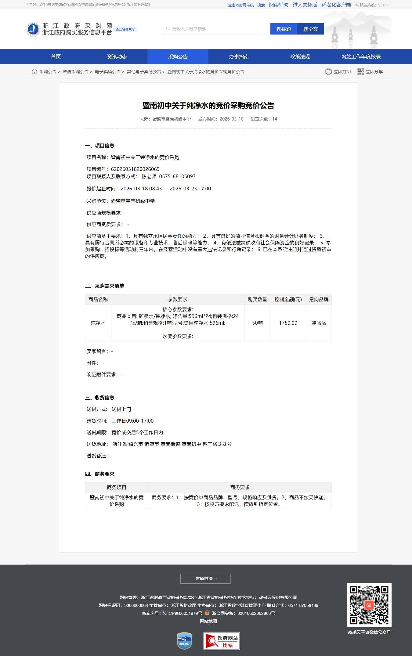 浙江關于純凈水的競價采購競價公告
