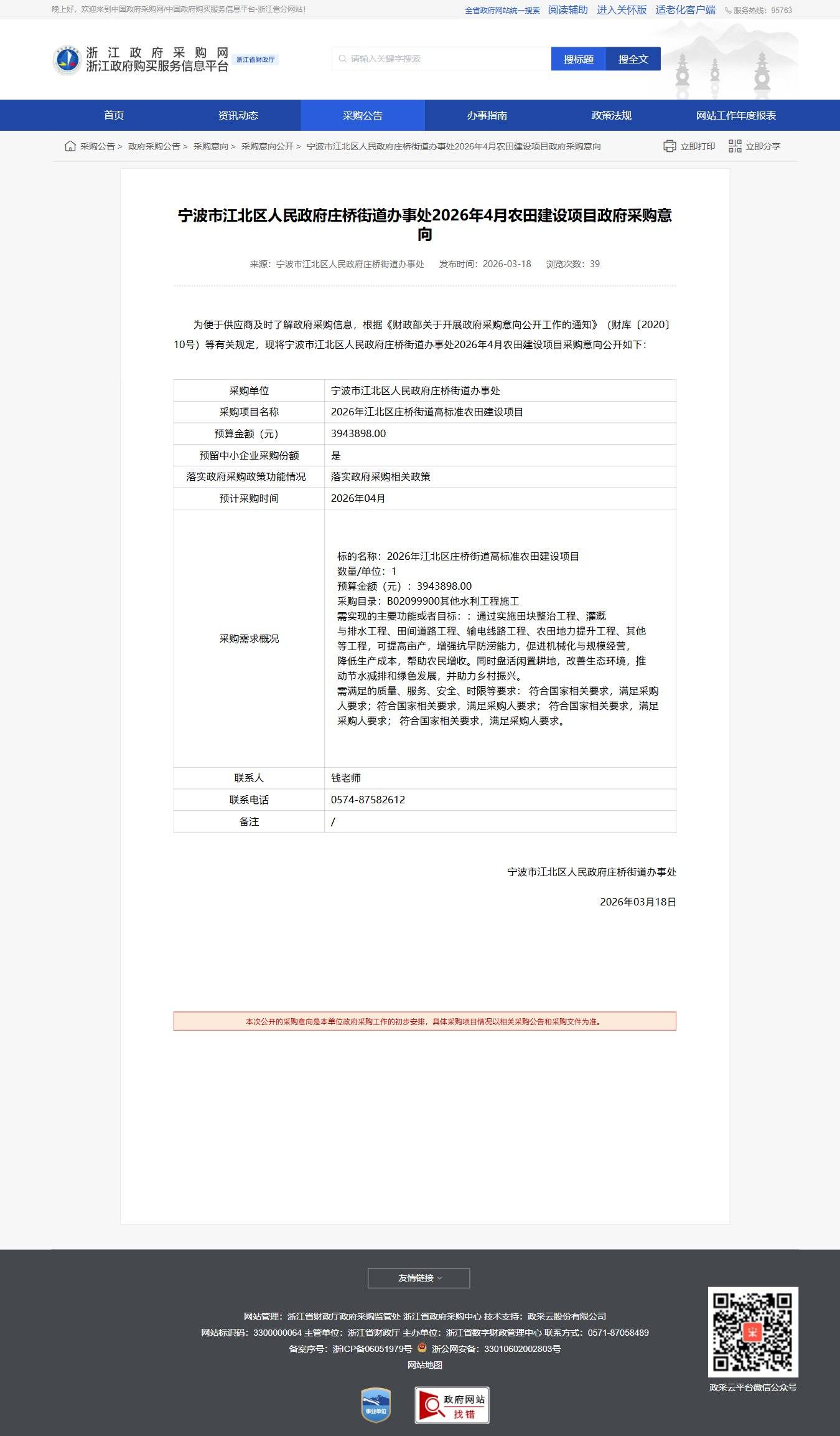 浙江寧波市江北區人民政府莊橋街道辦事處2026年4月農田建設項目政府采購意向公告