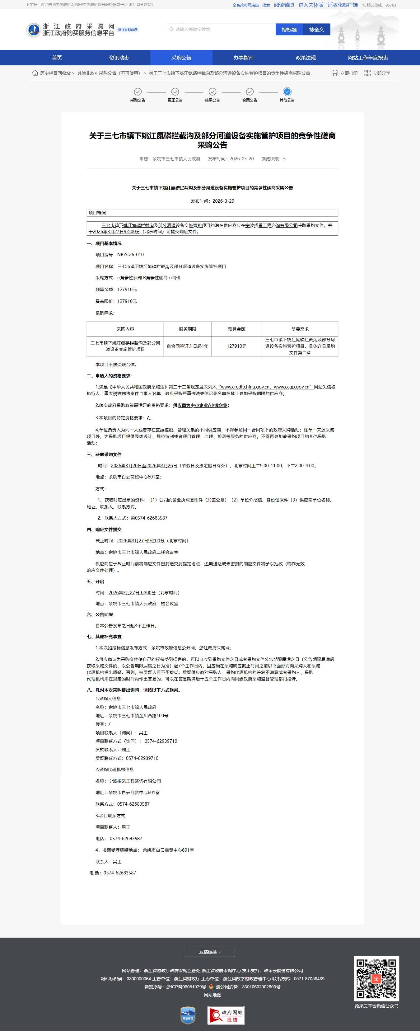 浙江關(guān)于三七市鎮(zhèn)下姚江氮磷攔截溝及部分河道設(shè)備實(shí)施管護(hù)項(xiàng)目的競(jìng)爭(zhēng)性磋商采購(gòu)公告