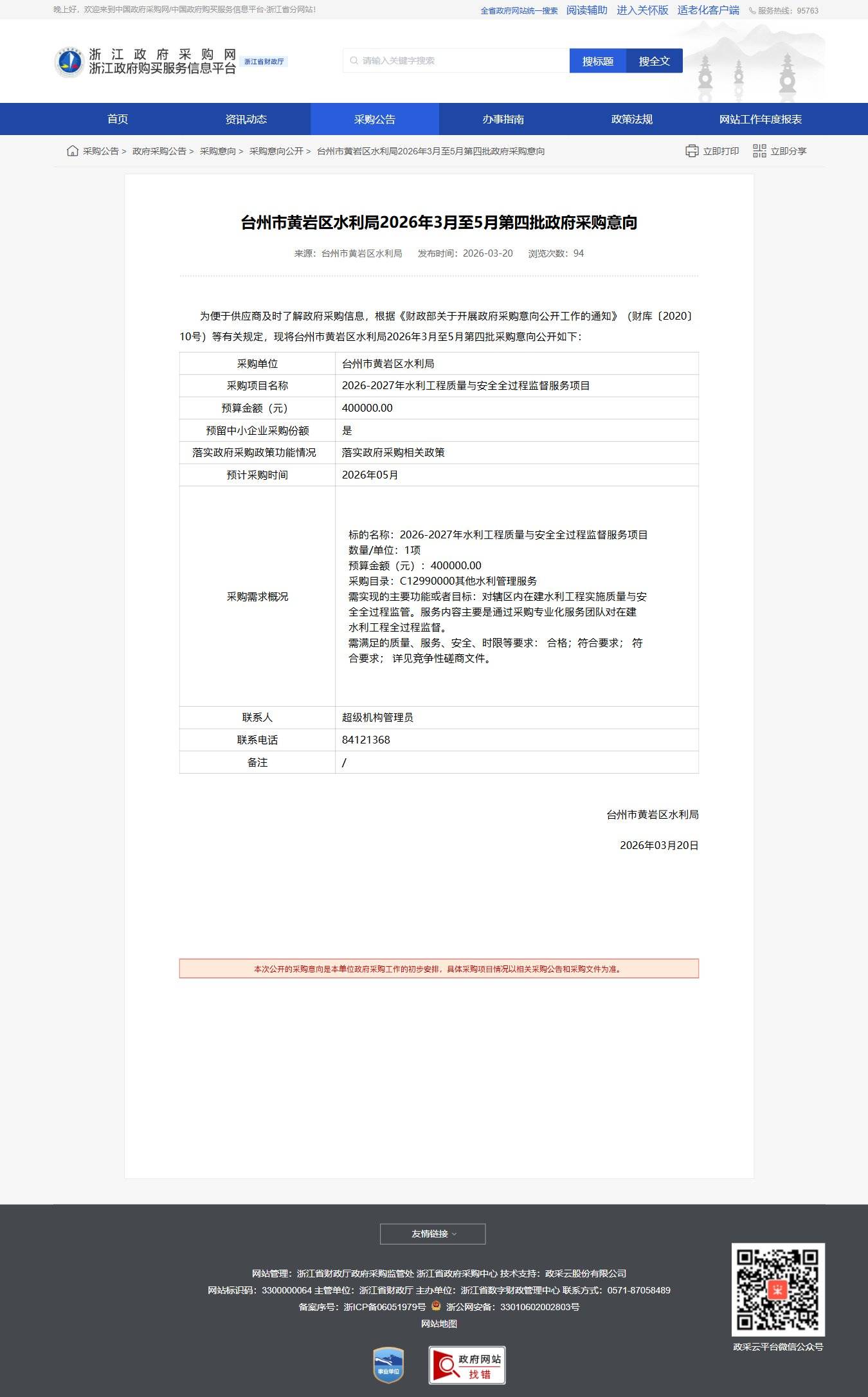 浙江臺州市黃巖區(qū)水利局2026年3月至5月第四批政府采購意向公告