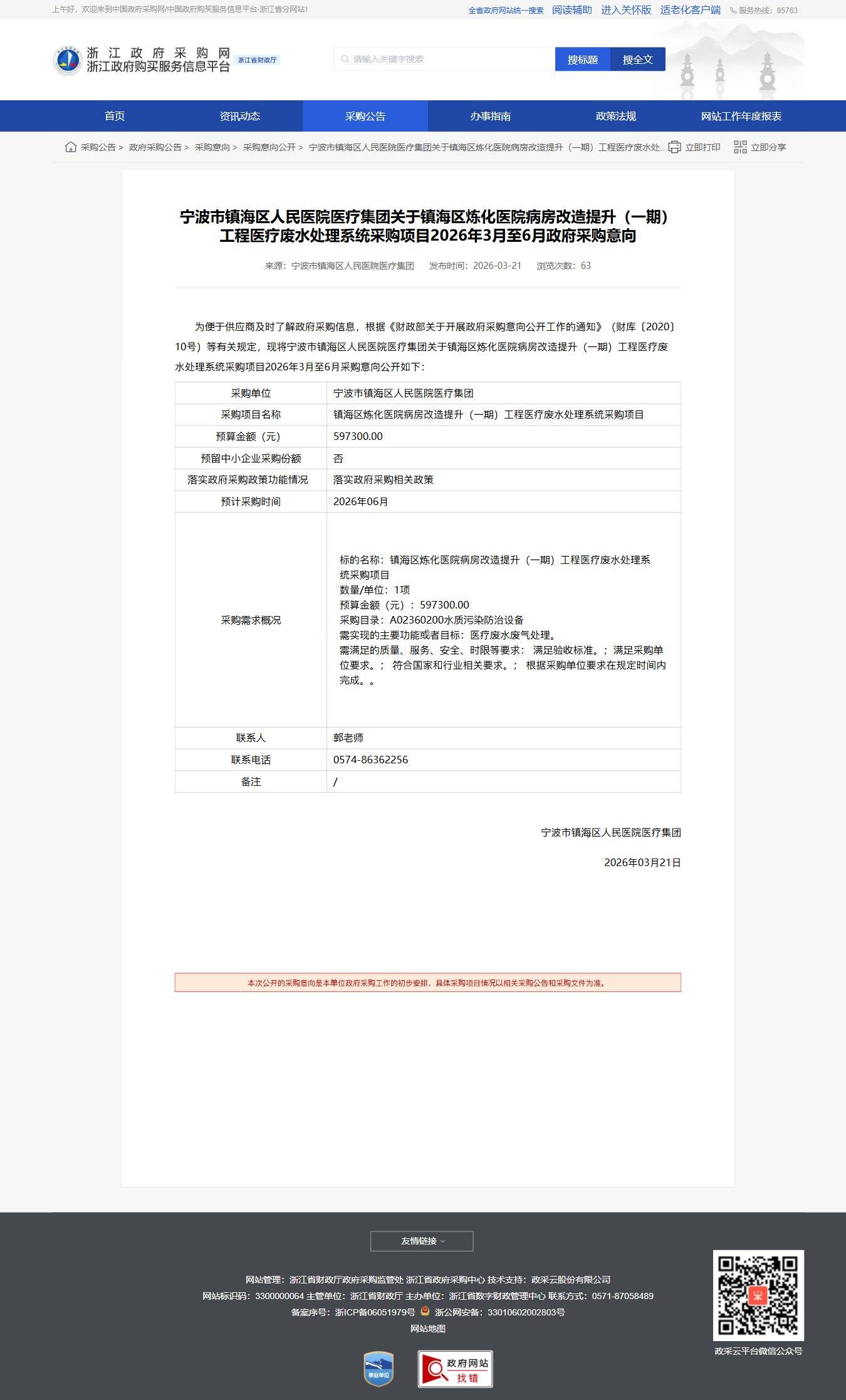 浙江關(guān)于鎮(zhèn)海區(qū)煉化醫(yī)院病房改造提升(一期)工程醫(yī)療廢水處理系統(tǒng)采購項目2026年3月至6月政府采購意向?qū)幉ㄊ墟?zhèn)海區(qū)人民醫(yī)院醫(yī)療集團