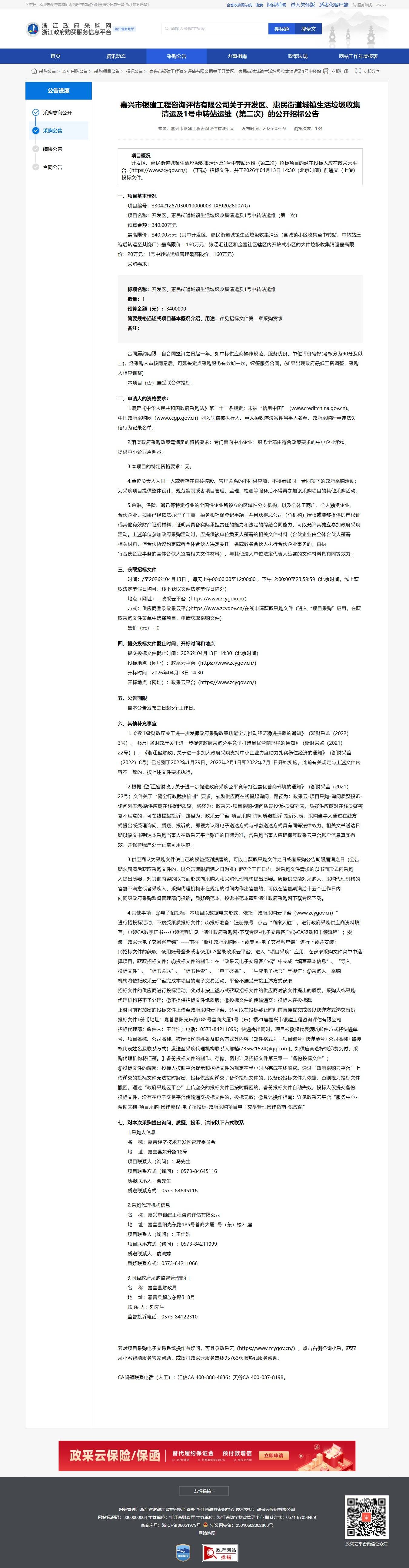 開發區、惠民街道城鎮生活垃圾收集清運及1號中轉站運維(第二次)招標項目的潛在投標人應在政采云平臺(https://www.zcygov.cn/)下載招標文件,并于2026年04月13日14:30(北京時間)前遞交(上傳)投標文件。