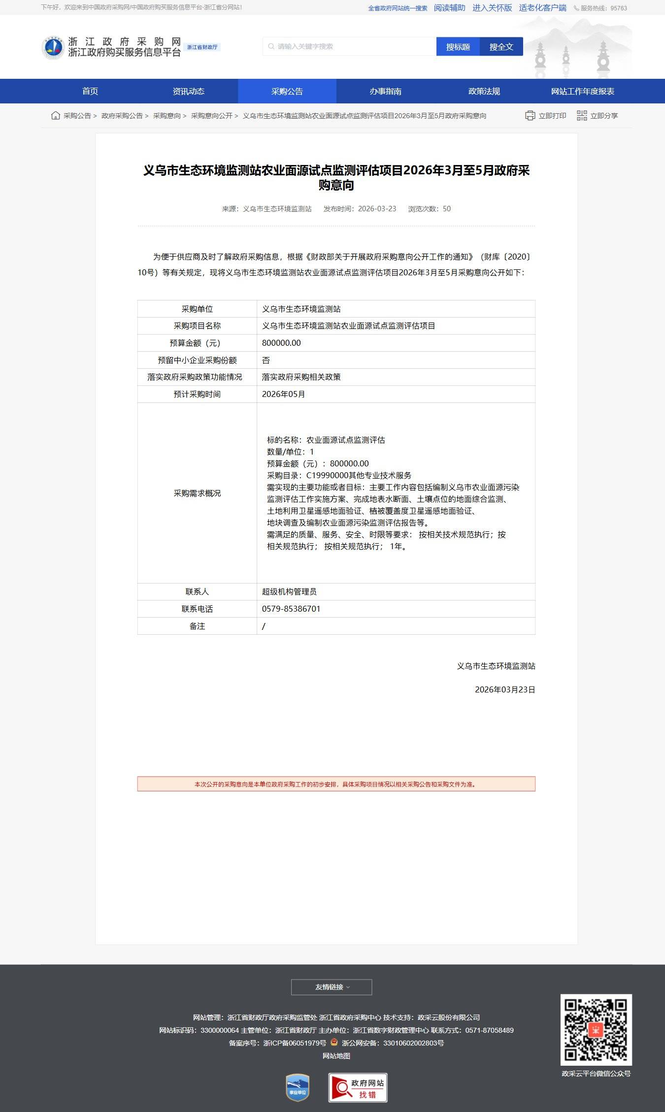 浙江義烏市生態(tài)環(huán)境監(jiān)測(cè)站農(nóng)業(yè)面源試點(diǎn)監(jiān)測(cè)評(píng)估項(xiàng)目2026年3月至5月政府采購(gòu)意向公告