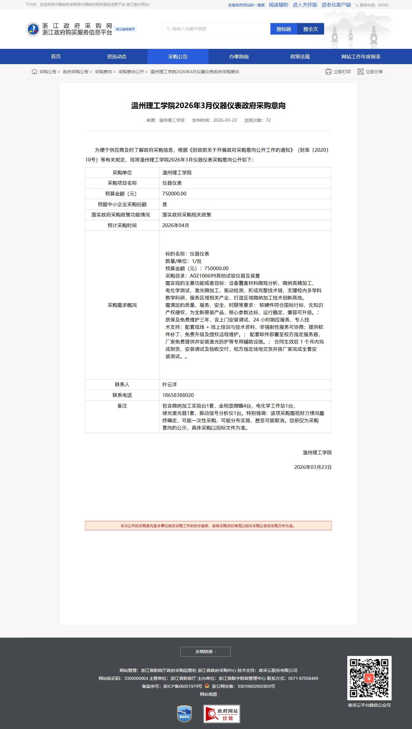 浙江溫州理工學院2026年3月儀器儀表政府采購意向公告