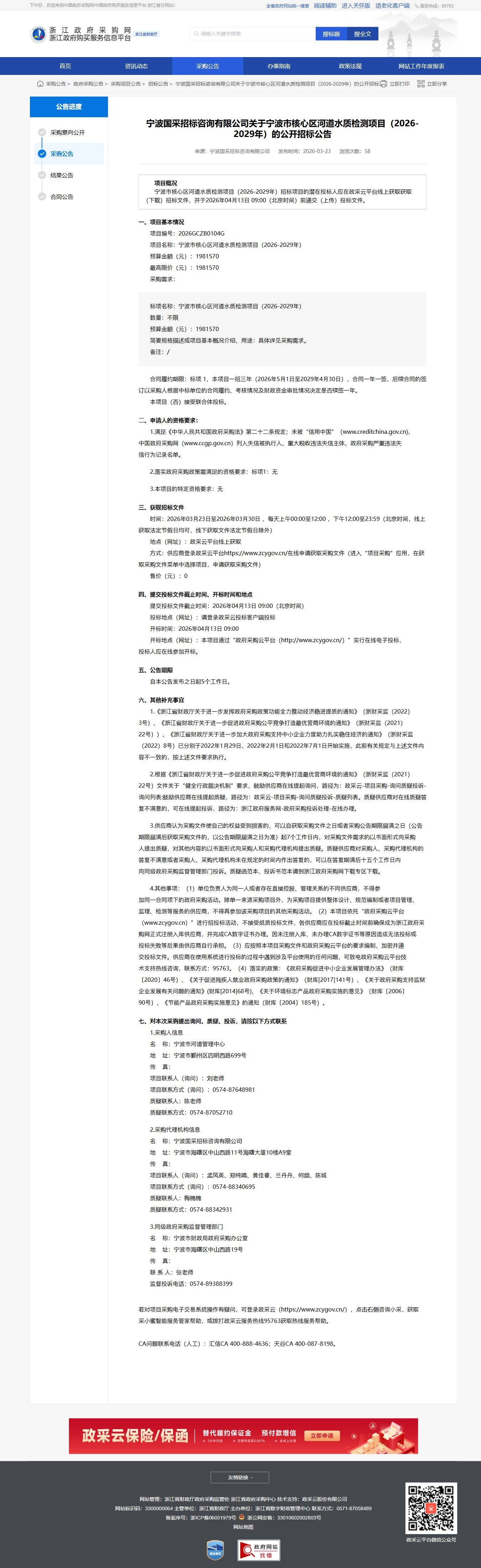 浙江關于寧波市核心區河道水質檢測項目(2026-2029年)的公開招標公告