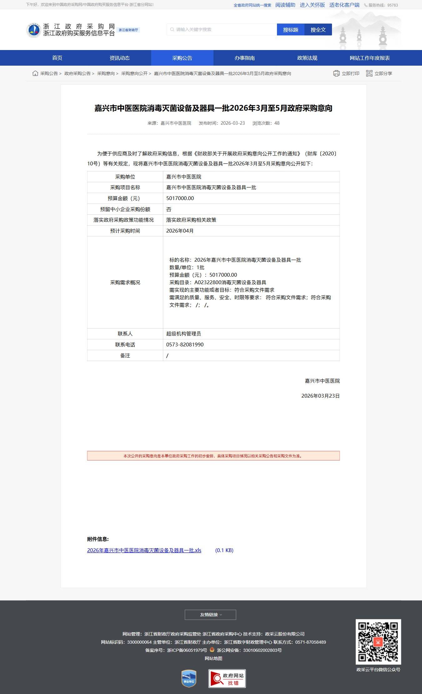 浙江嘉興市中醫醫院消毒滅菌設備及器具一批2026年3月至5月政府采購意向公告
