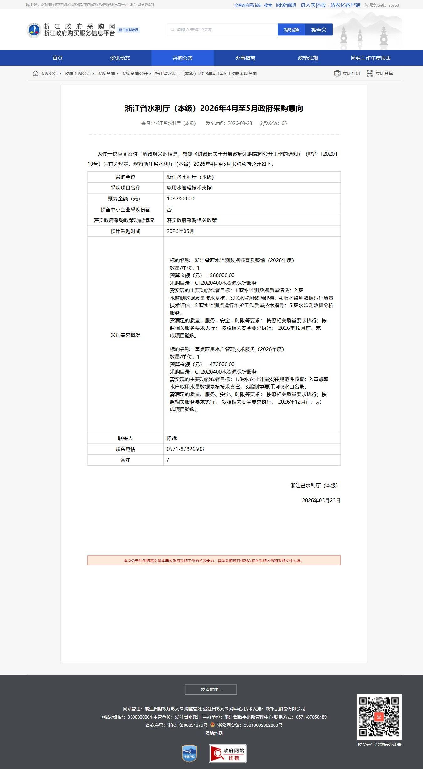 浙江省水利廳(本級)2026年4月至5月政府采購意向公告