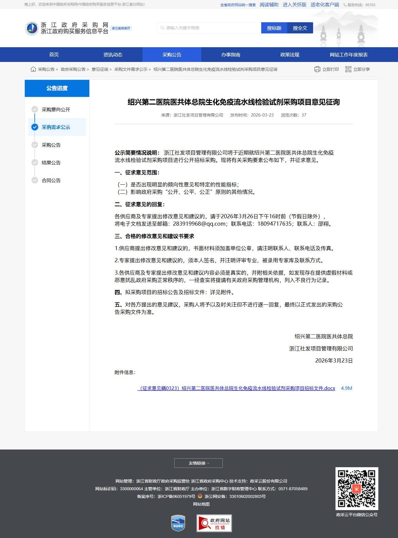 浙江紹興第二醫院醫共體總院生化免疫流水線檢驗試劑采購項目意見征詢