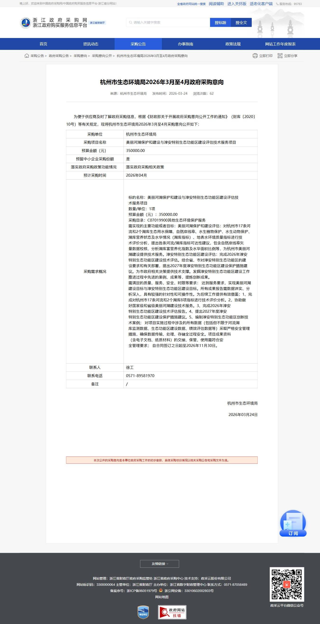 浙江杭州市生態(tài)環(huán)境局2026年3月至4月政府采購意向公告