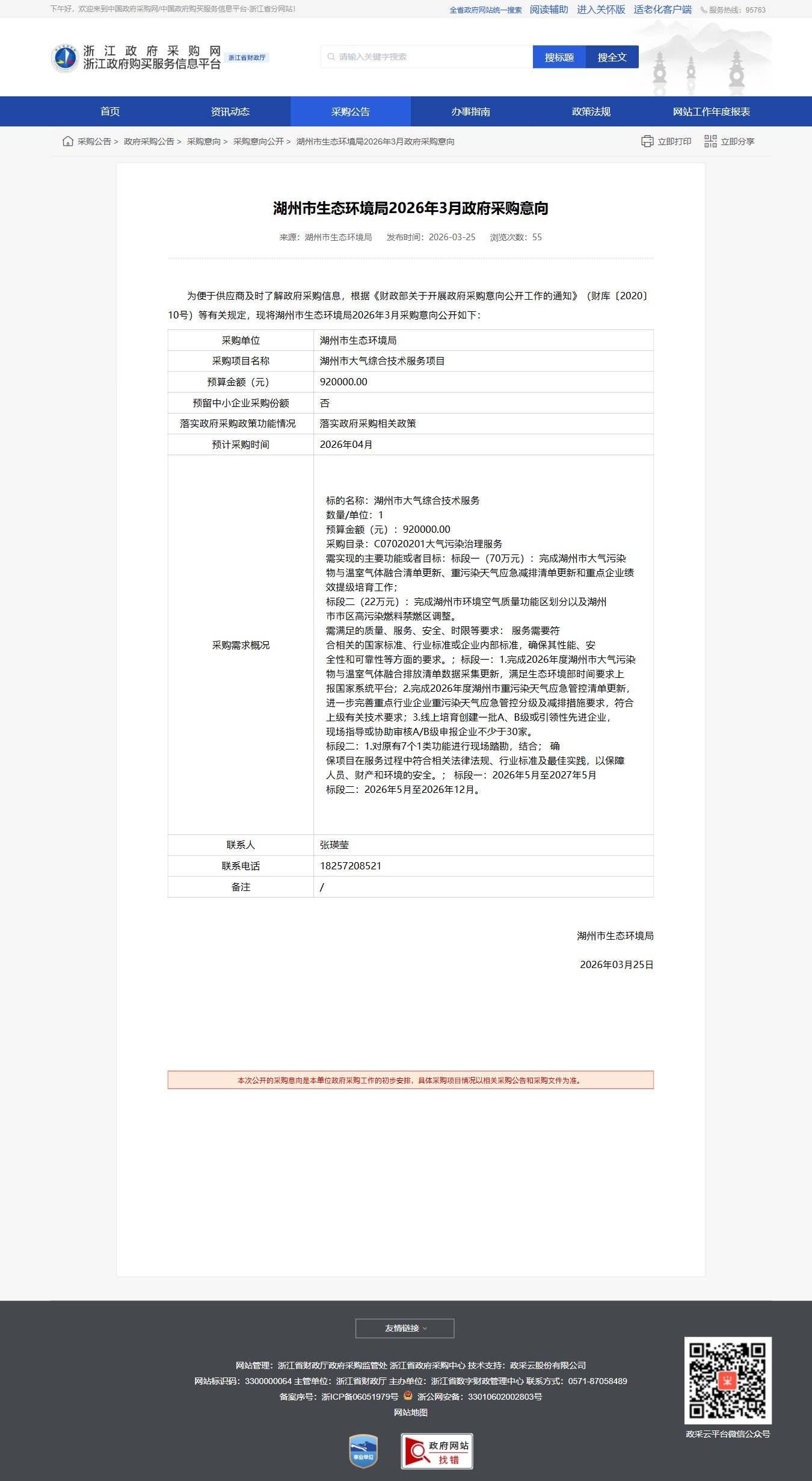 浙江湖州市生態環境局2026年3月政府采購意向公告