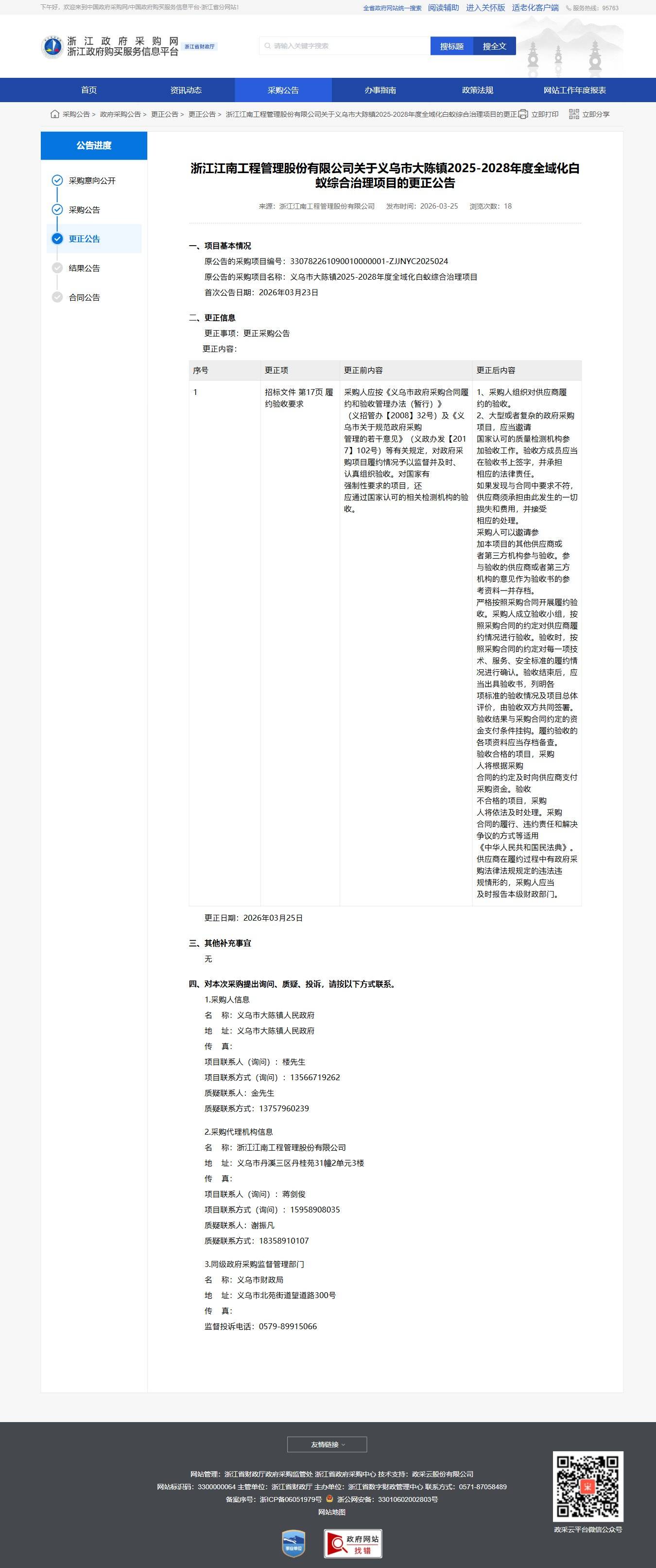 浙江關于義烏市大陳鎮2025-2028年度全域化白蟻綜合治理項目的更正公告